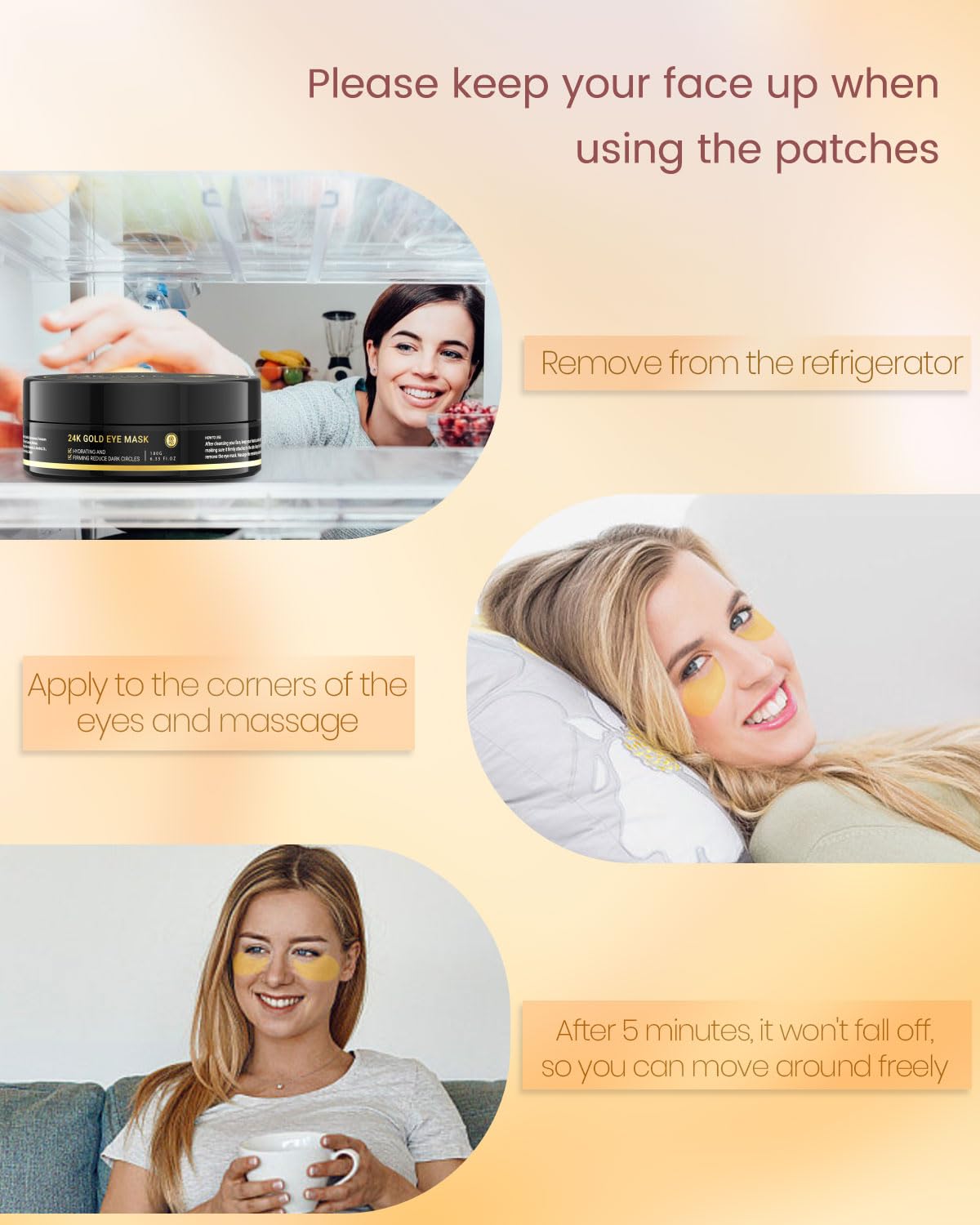 24K Gold Under-Eye Patches, 120 Pcs Collagen Serum Eye Mask Pads, for Bags/Anti-Aging/Wrinkles/Rejuvenation/Hydration, Cooling & Soothing the Skin, Relieving Fatigue, 12.7 Fl Oz, 2 Pack