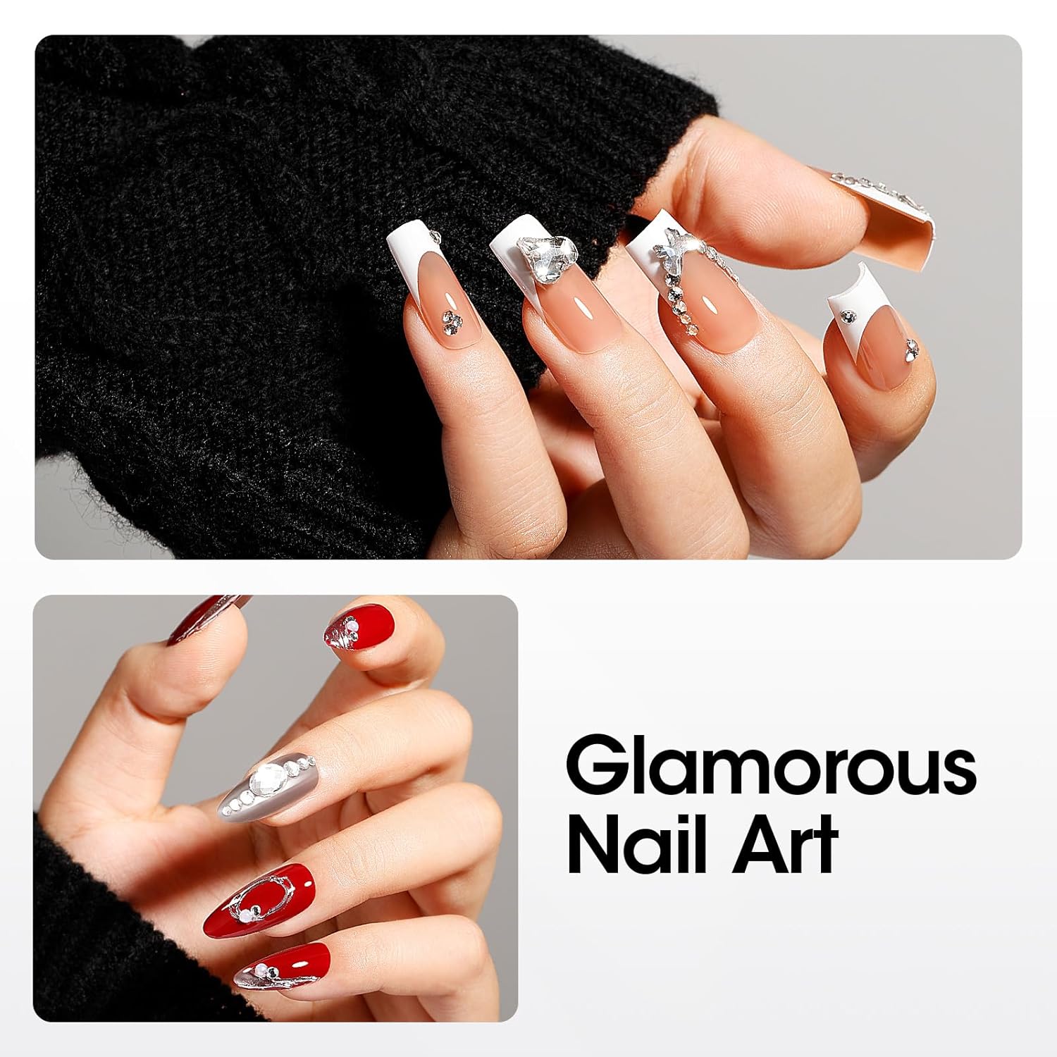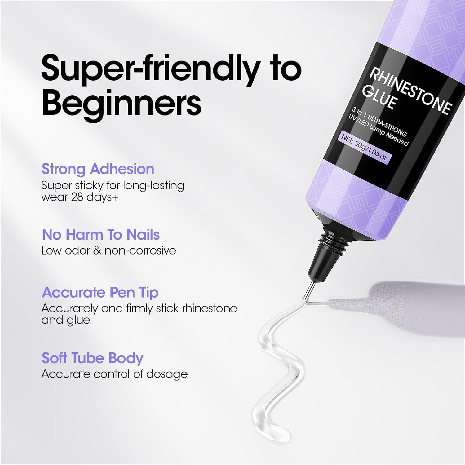 - Super Adhesive Rhinestone Glue for Nails: With stable and viscous gel formula, the 30g clear nail gems glue gel is super sticky to firmly hold various decorations, like nail gems, charms, jewels, diamonds, beads, and nail rhinestones(large or non-flatback rhinestones) etc. The proper application can help your nail designs long lasting for 28+ days (UV LED needed). Enjoy your own nail art ideas with our nail charm glue gel