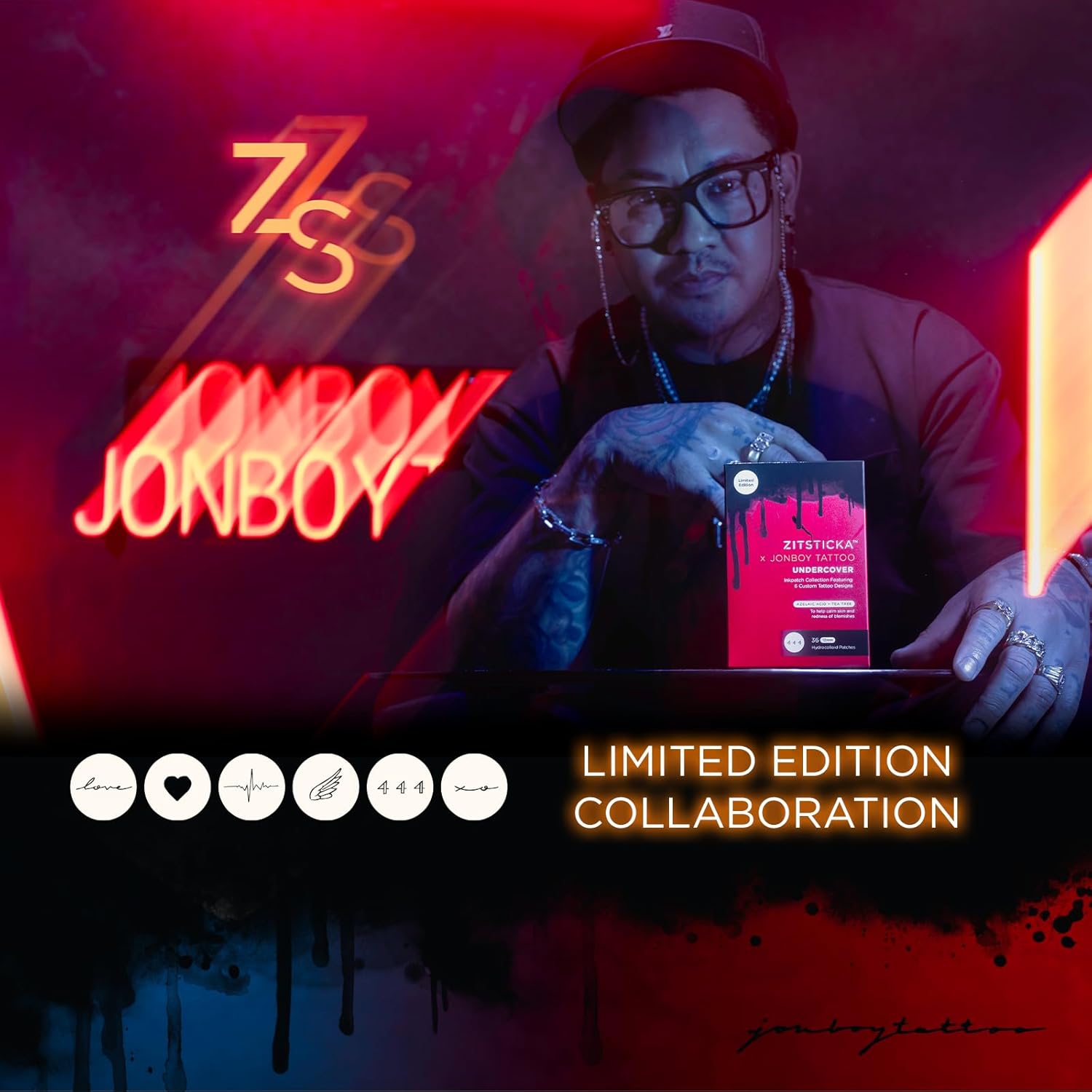 - LIMITED EDITION COLLABORATION: Discover the exclusive ZitSticka x Jonboy InkPatch Collection temporary tattoos, a custom collaboration with celebrity tattoo artist Jonboy. Featuring four unique Jonboy tattoo designs, these patches celebrate self-acceptance and positive mental health, merging skincare with art in a way that’s both meaningful and effective.