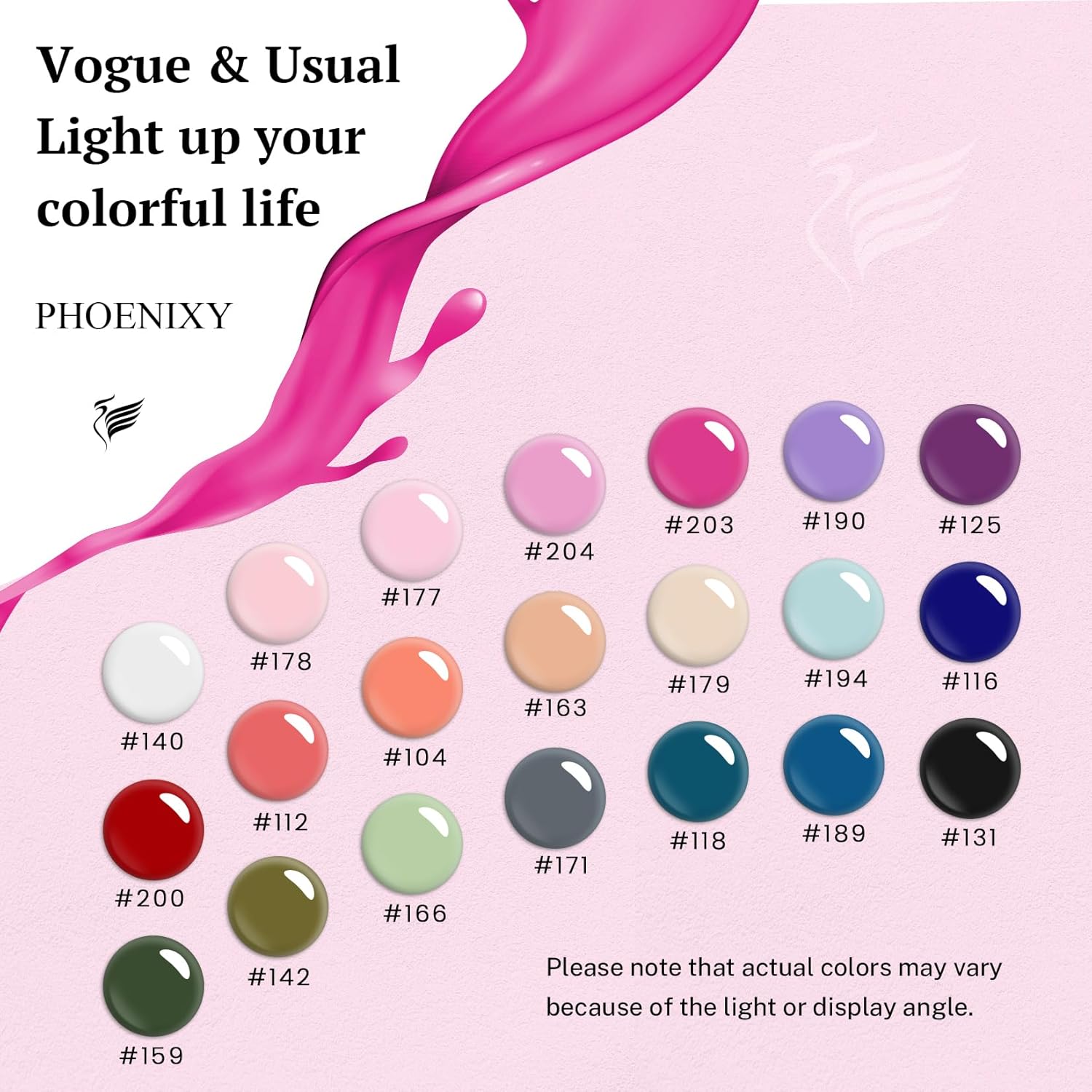 - [Phoenixy Gel Nail Polish Set] Phoenixy gel nail polish set includes 21*7ml gel polish, 7ml base coat, 7ml top coat, and 7ml matte top coat. A cost-effective kit for manicure beginners and lovers. With some practice, you can get beautiful nail art for all seasons and occasions- parties, holidays, work or daily life.