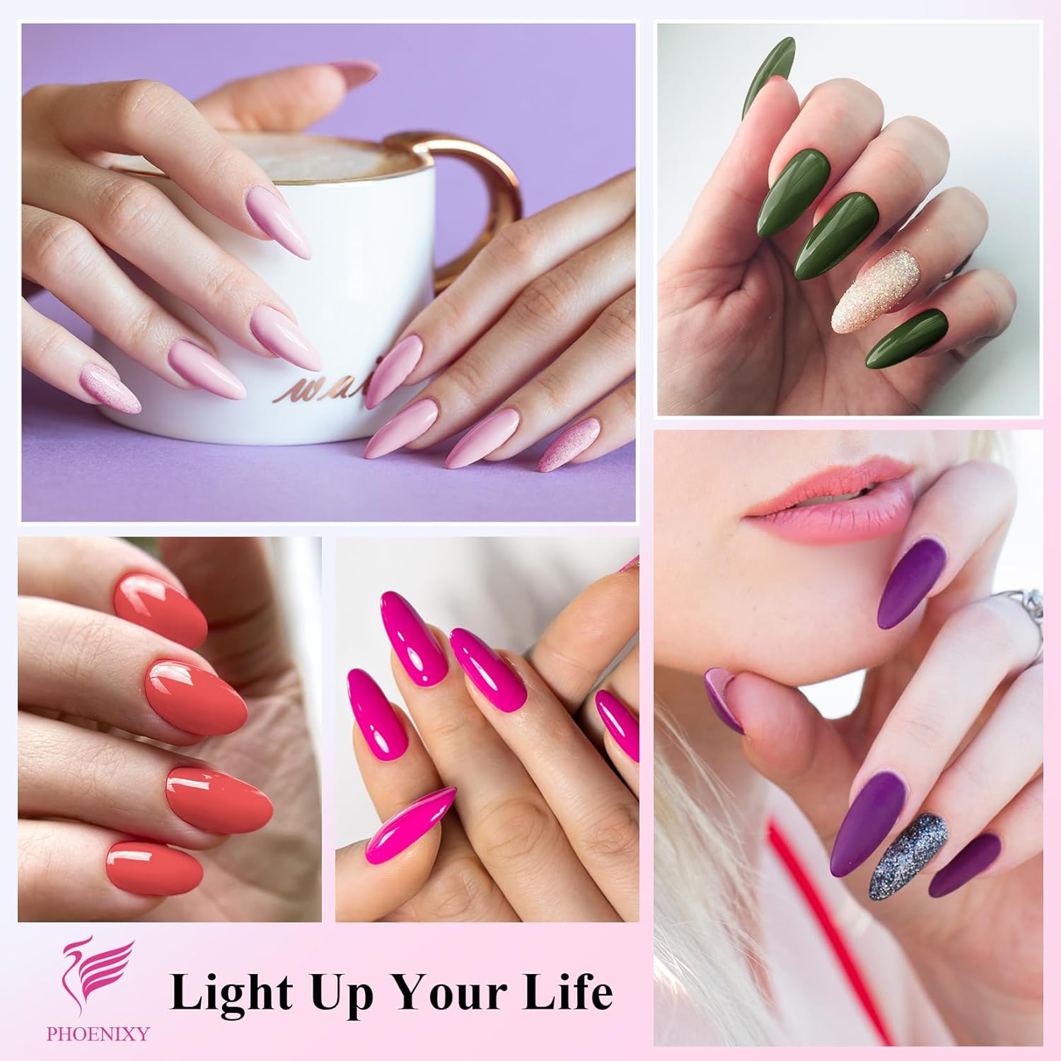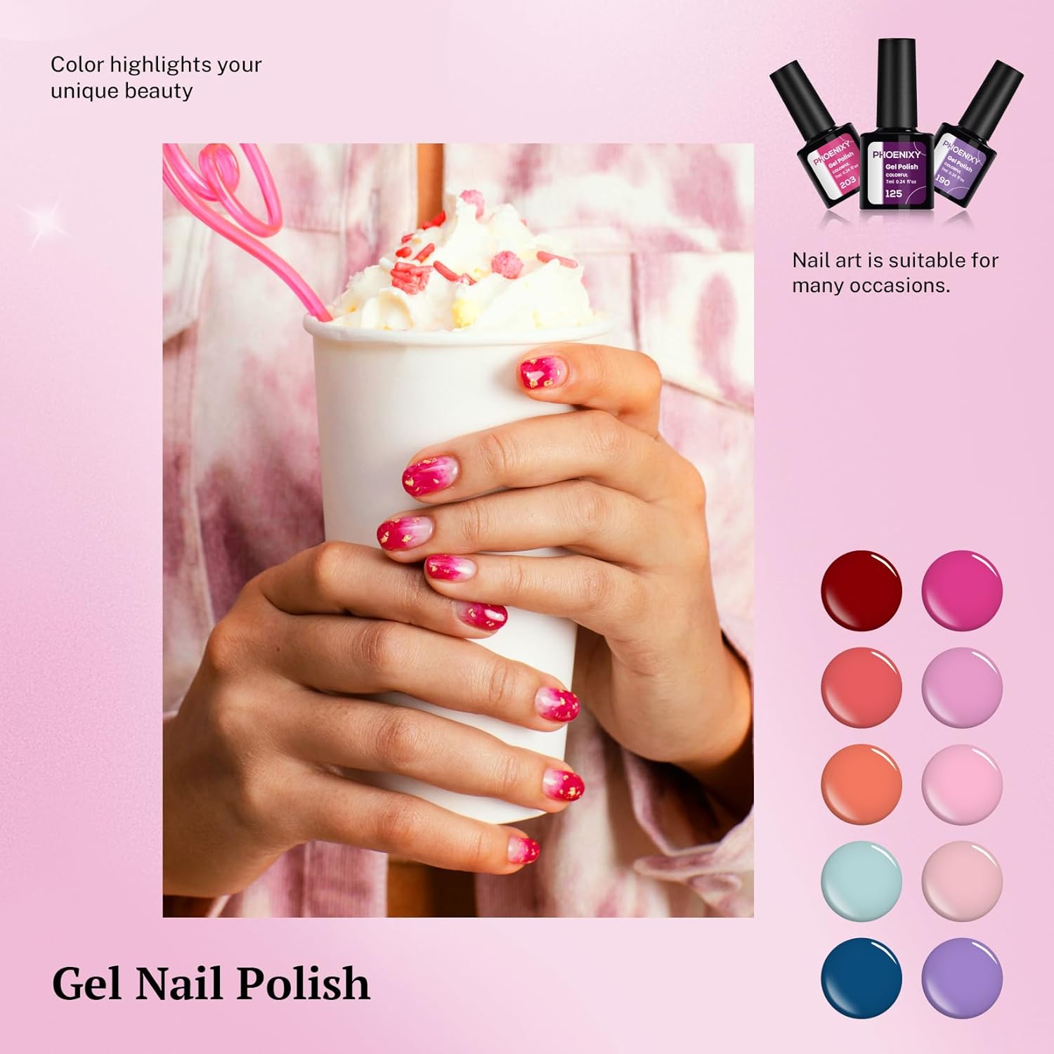 - [High Quality& Long Lasting] Made of natural resin, Phoenixy gel nail polish contains botanical ingredients and lowest smell, harmless to skins or nails. The higher quality promises better adhesion and gloss, smooth application and strong color-locking ability. The nail polish can last more than 3 weeks with proper application (keep your nails clean with file and buffer before applying base coat). Take a skin test before use. If any discomfort or allergy occurs, please stop using it immediately.