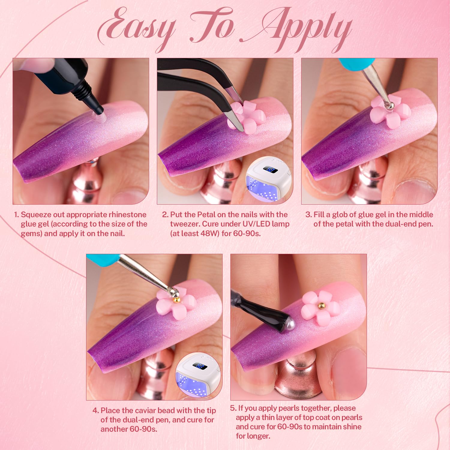 - ✿ Package Content -- It comes with assorted nail charms, including colorful flower nail charms with mini metal caviar beads, 75 pcs nail bow charms, shiny clear & AB glass rhinestones, white half round pearls. A tube of 15ml nail charm glue (UV curing needed), tweezers and picking pencil are also equipped for your convenience.