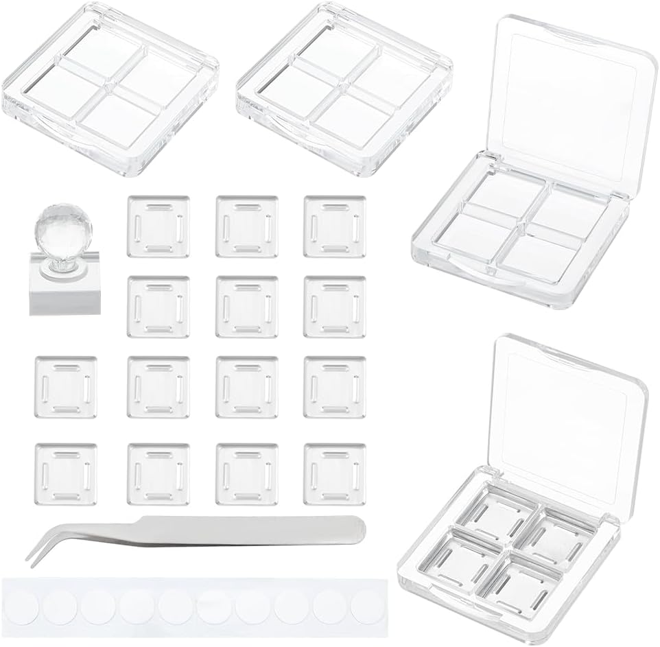 - Package Includes: Includes 4pcs eyeshadow boxes, 20pcs aluminum palettes, 30pcs PE film stickers with a embossing tool and stainless steel beading tweezer. Eyeshadow box is about 60.5x60x12mm/(2.38x2.36x0.47inch); square aluminum palette pans is about 22.5x22.5x3.5mm/(0.88x0.88x0.14inch).