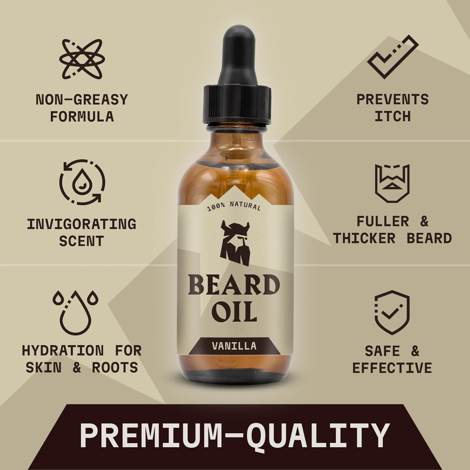 - Viking Beard Care: Elevate your grooming game with Striking Viking Vanilla Beard Oil, your go-to for beard growth oil and beard care. Packed with jojoba and almond oils, it deeply hydrates and softens your facial hair and skin