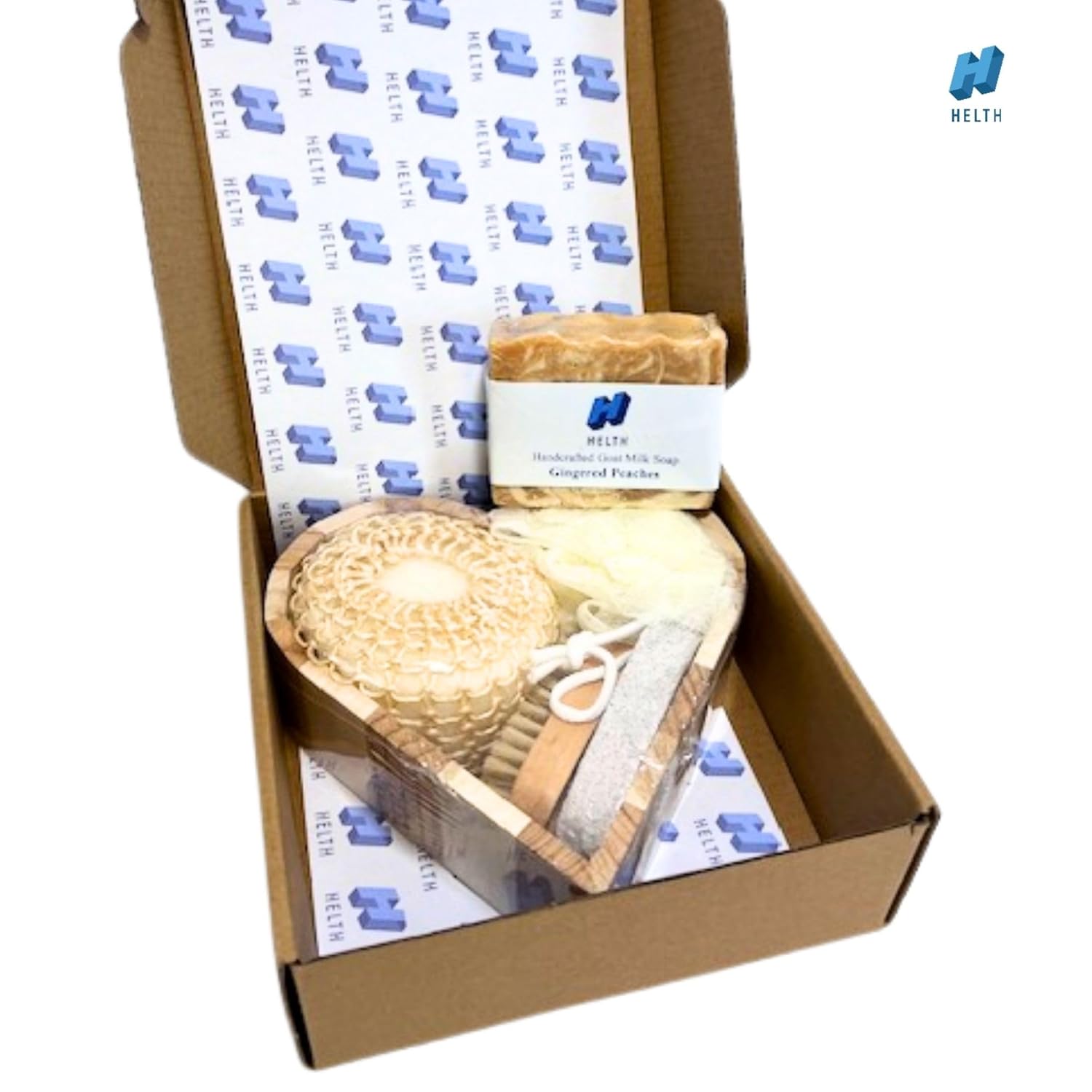 - Practical 6pcs Gift Basket. Uniquely designed packaging heart shaped box featuring a loofah, body brush, sisal sponge, and handmade distinctively crafted amazingly scented goat milk soap.