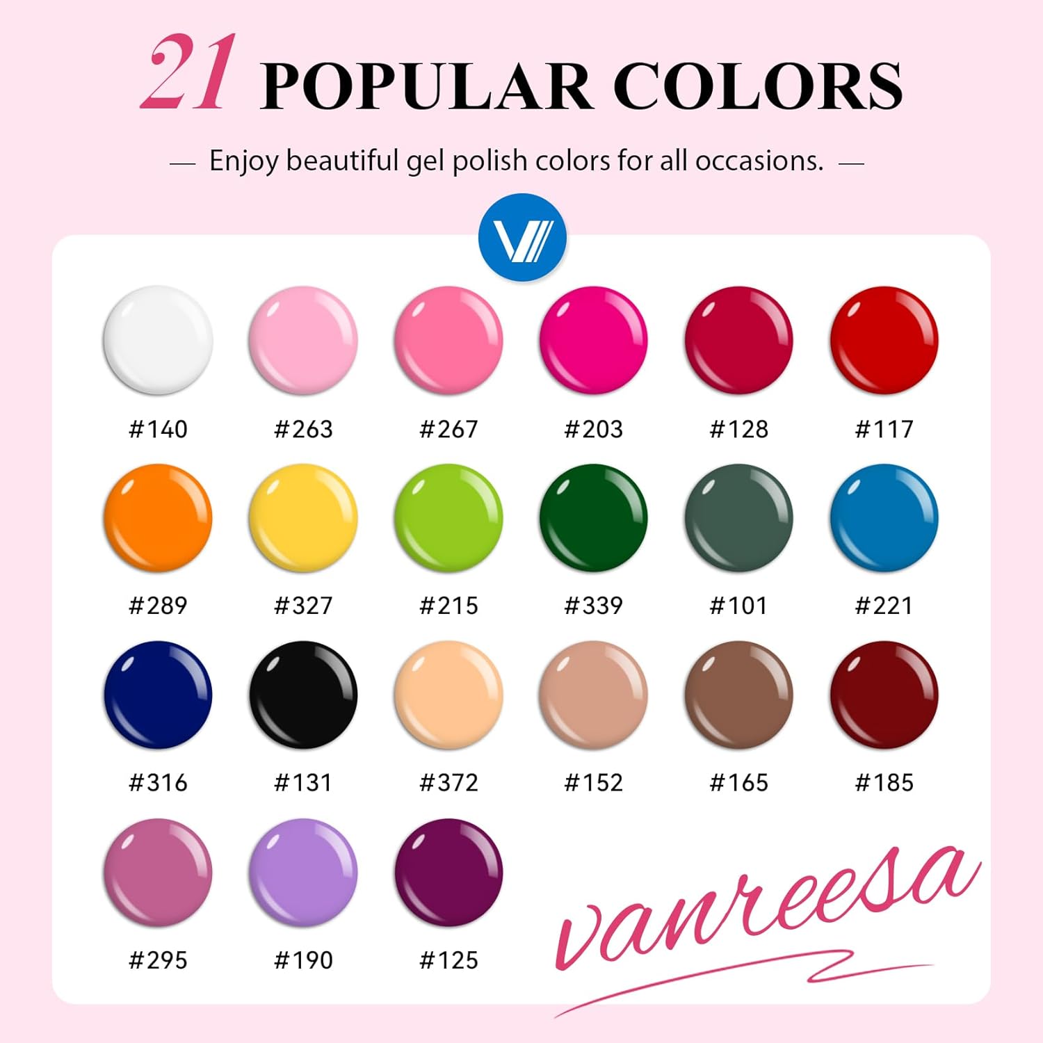 - ăRelaxing Vacation Series ColorsăVANREESA's handpicked 21 colors of gel nail polish set includes currently popular shades: white, pink, red, orange, yellow, green, blue, purple, brown, nude, black, etc. These gel polish colors are currently trendy, versatile and practical, suitable for all styles. You can choose any color to match and combine to create your own unique manicure style!