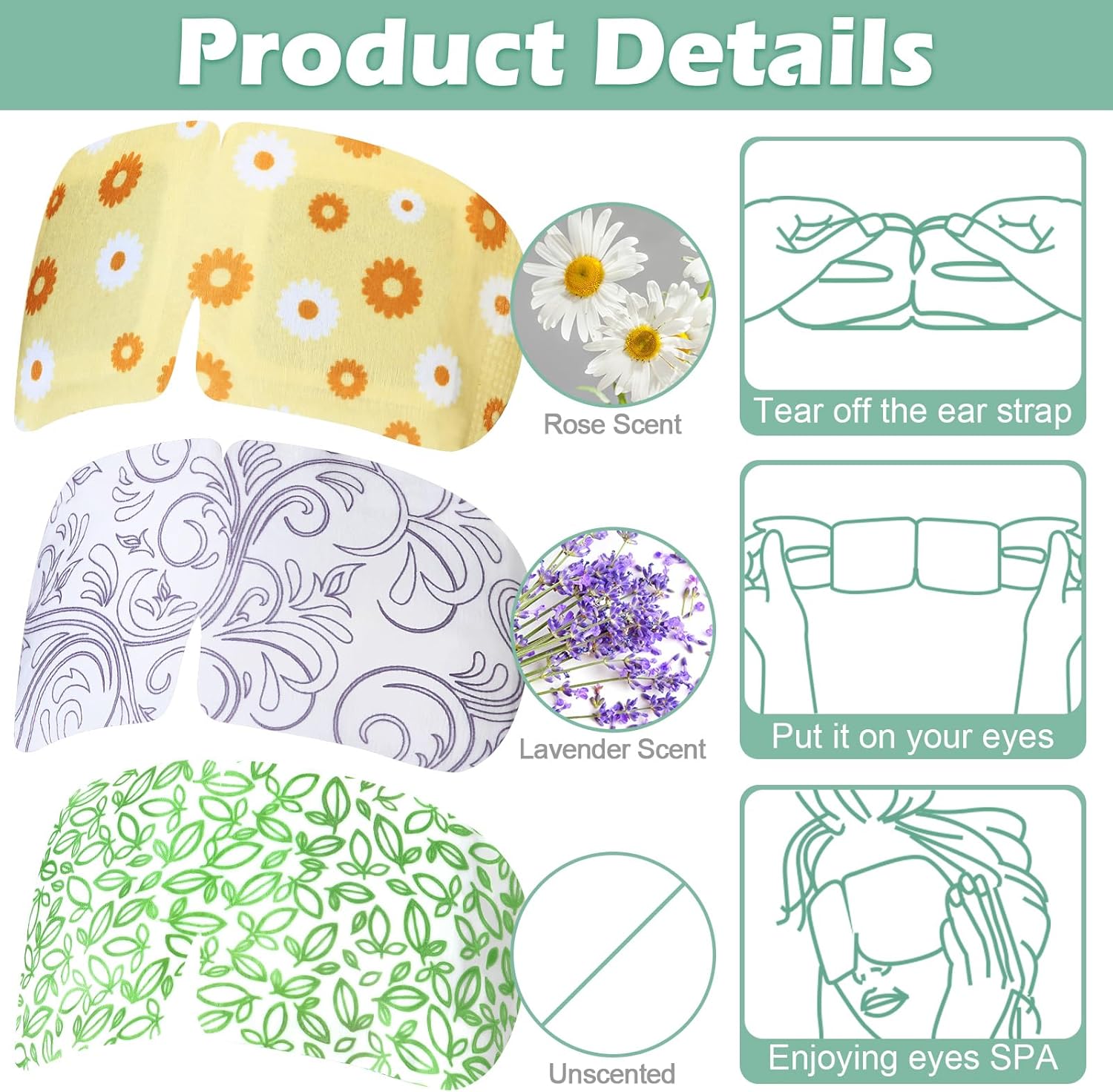 - Steam Eye Mask Bulk: you will get 96 packs of self heating eye masks for dry eyes in a package, available in 3 styles including lavender, chamomile, and unscented; There are 32 packs of each, enough to meet your needs for home spa, relaxation, eye fatigue relief