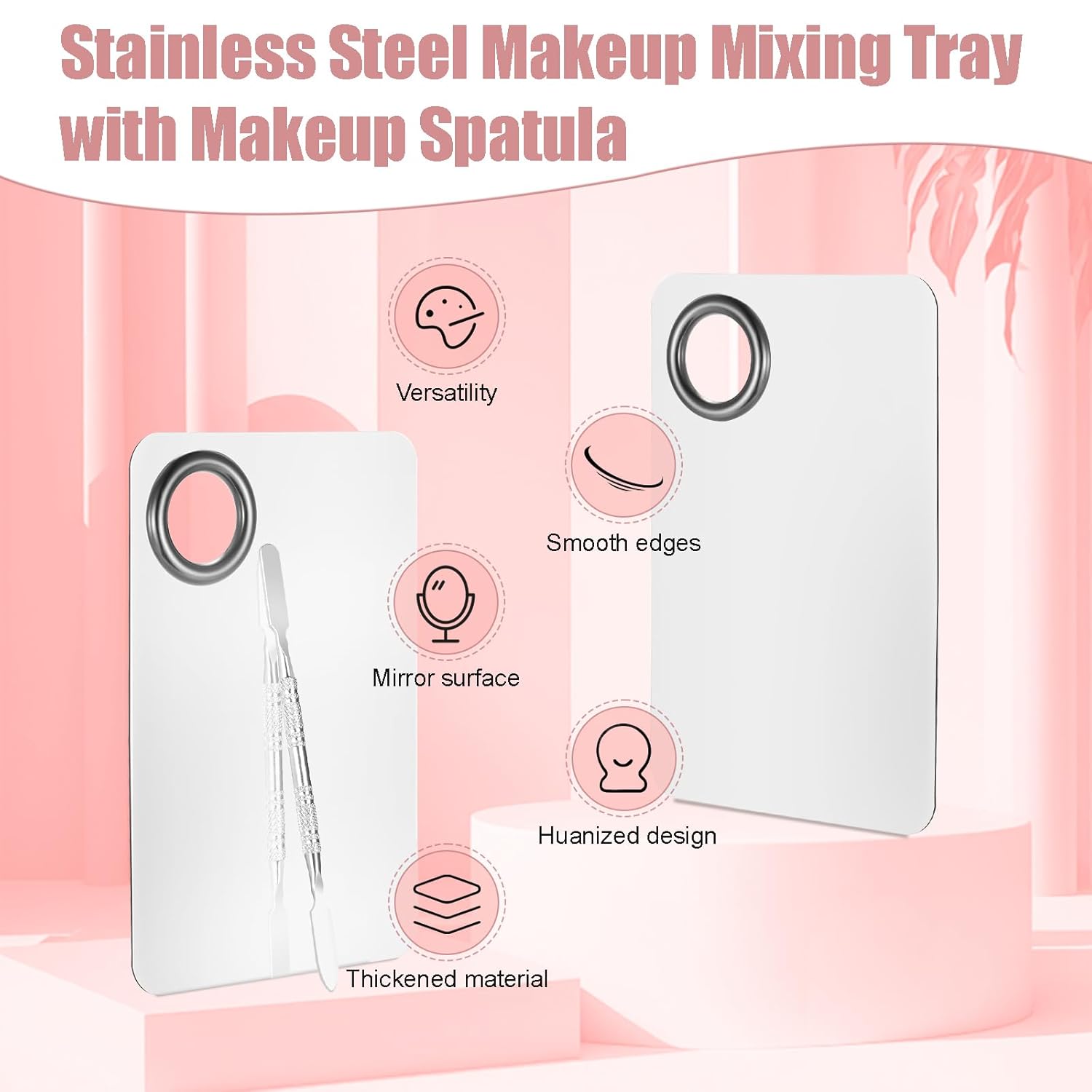 - 1.【Makeup Mixing Tray with Makeup Spatula Set】Includes 1 foundation mixing palette, 1 mixing stick, 1 foundation spatula korean, and 1 Y-shaped foundation shovel, all made of stainless steel. They are compact and convenient for travel, suitable for makeup enthusiasts, professional makeup artists, or beginners.