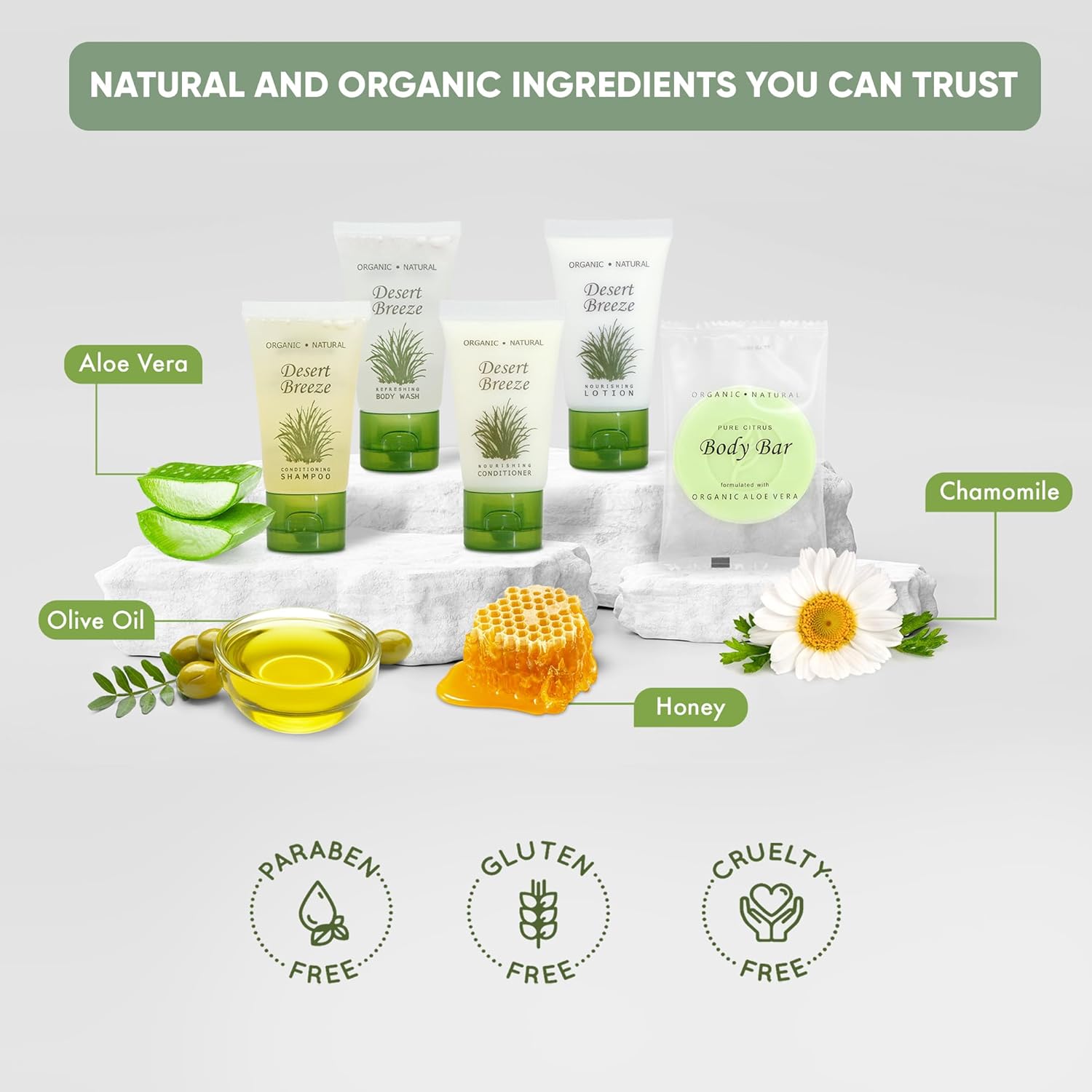 - WHY CHOOSE DESERT BREEZE? Our high-end formula & environmentally friendly beautiful design bring elegance to any upscale rental or vacation property. Our travel size, pump, and gallon toiletries are paraben-free, gluten-free & made with organic aloe, honey, & olive oil for soft skin & hair! We offer a range of products and cater to all your on-the-go personal care needs.