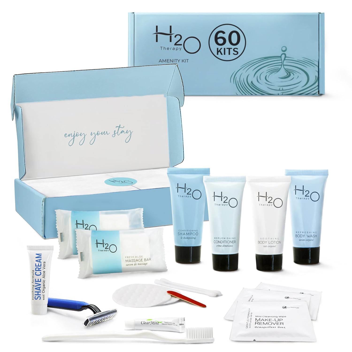 H2O Therapy Amenity & Accessory Kit | 0.85 oz Travel Size Shampoo, Conditioner, Lotion, Body Wash, Massage Bar, Cleansing Bar, Shave & Dental Sets, Make-Up Remover Wipes, & Vanity Kit | 60 sets/case