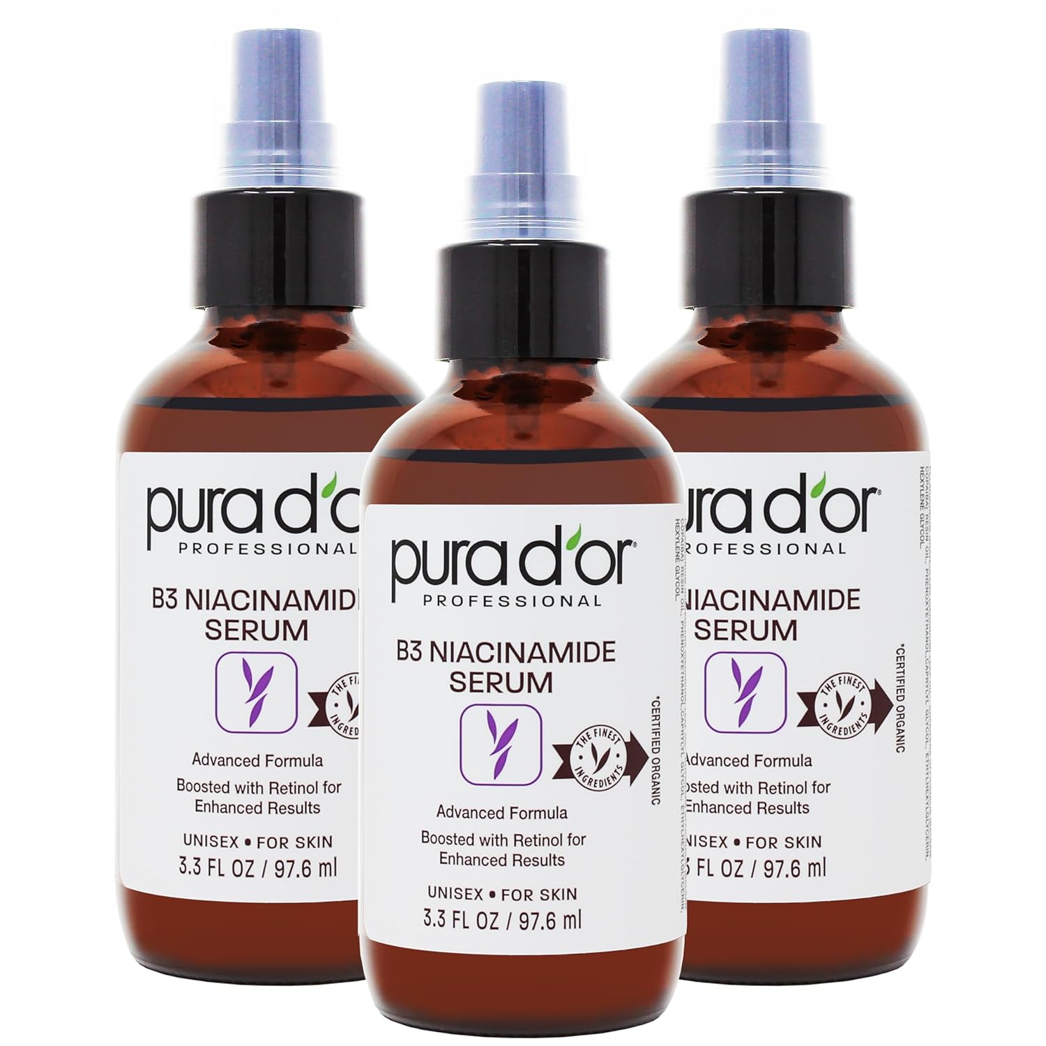 PURA D'OR B3 Niacinamide Advanced Facial Serum (3.3oz x3 = 9.9oz) Skin Care Formula with Retinol For Wrinkles, Hydration & Complexion - All Skin Types, Hypoallergenic - Women & Men
