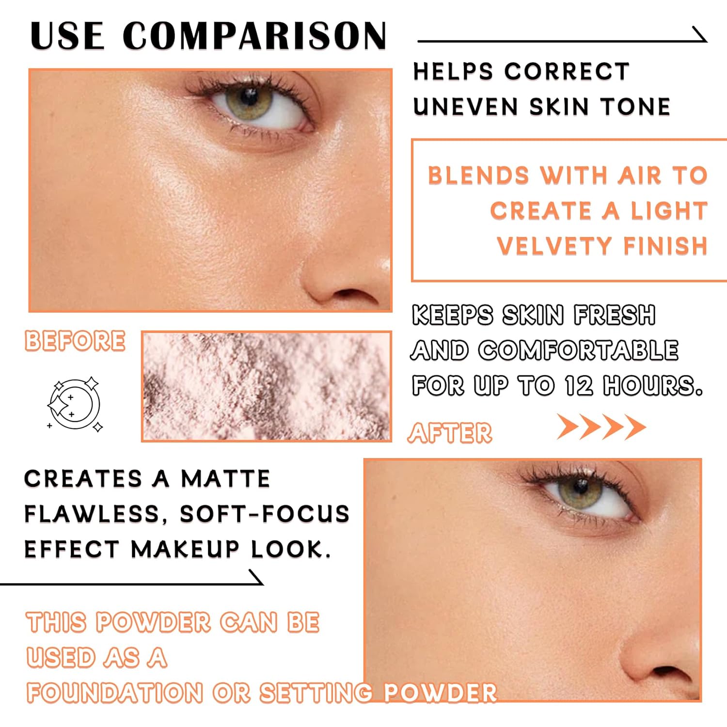 - 💖【Setting Face Powder】Setting face powder can set your makeup for a long time and provide the ideal coverage, for you to create a long-lasting glamorous and soft-focus flawless makeup, very suitable for setting or finishing makeup.
