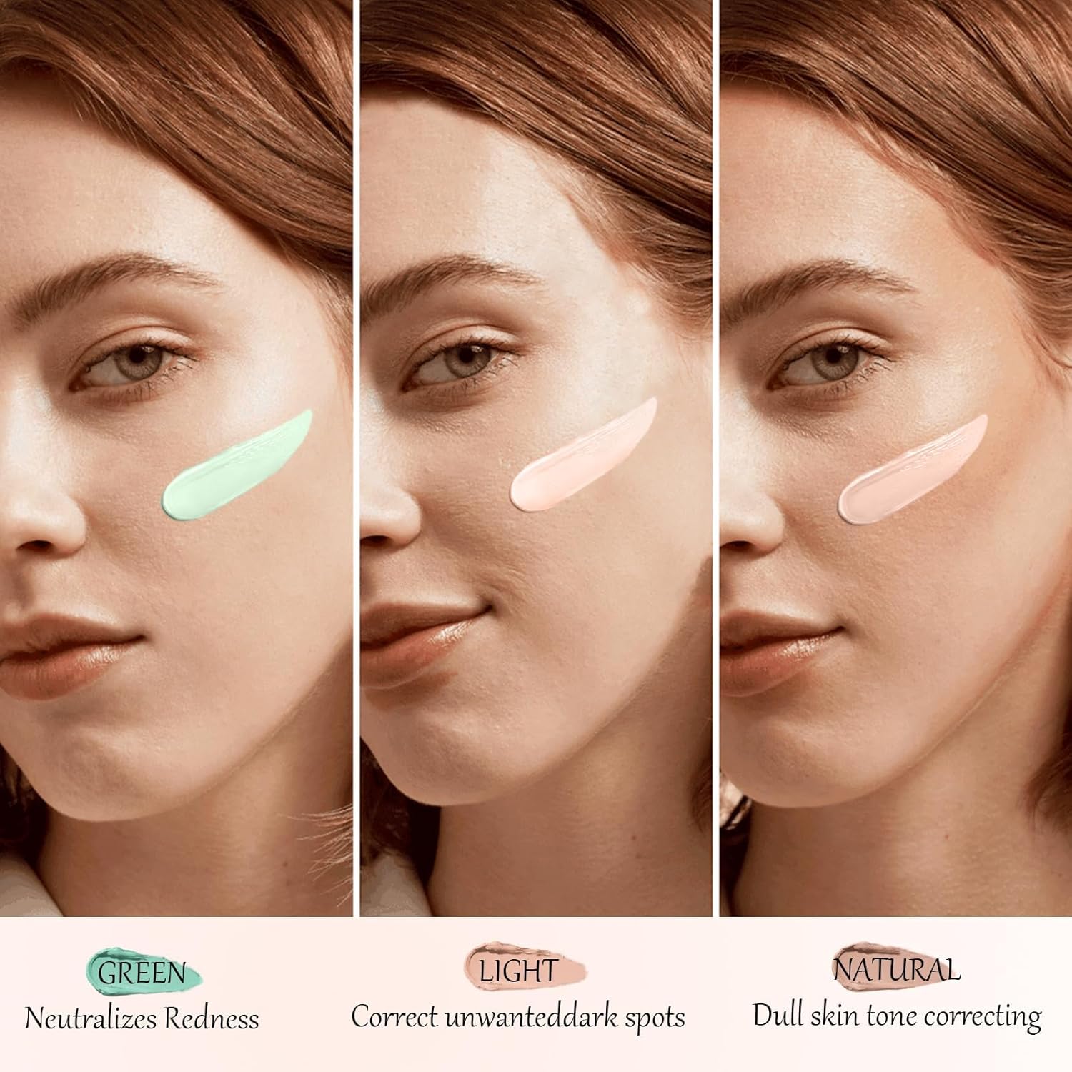 - COLOR CORRECTING: This 3 colors color corrector stick can meet your different skin tones correct needs. The green shade help to cover up redness and blemishes caused by acne, and conceals the reddish complexion. The natural shade can be used to correct unwanted dark spots or dullness. Cover and brighten the dark circles can use the light shade.