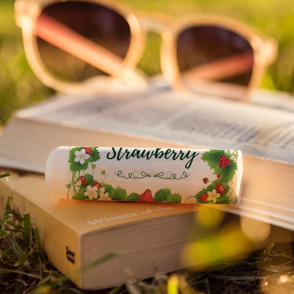 OLYCRAFT 100Pcs Self-Adhesive Lip Balm Tag Stickers 2.1x1.7 inch Waterproof Adhesive Label with Strawberry Rectangle Lipstick Tag Sticker for Lip Balm Container Tubes Lipstick Wrapping Decoration