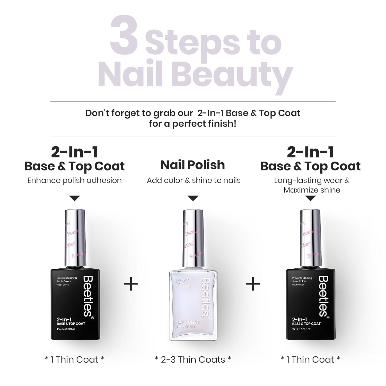 - 【Quick Dry Nail Polish】:Drying in just 1-2 minutes in air, without the use of UV lights, making manicures fast and hassle-free. It's time to say goodbye to UV Light with beetles nail polish. Base coat & top coat are required! This item does not include base&top coat, which needs to be purchased separately.