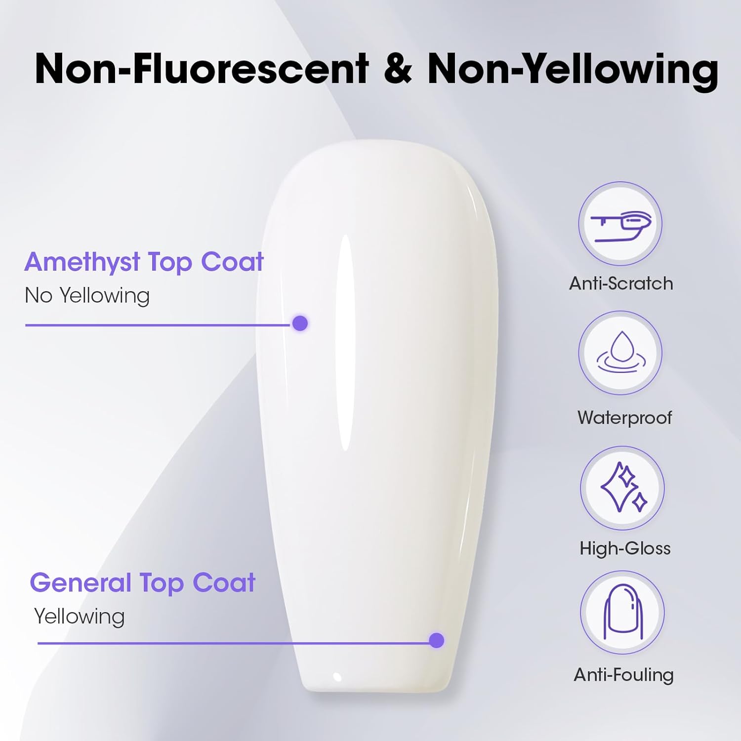 - Crystal Clear & Highly Translucent: Gellen’s Amethyst Top Coat Gel has a mauve tint but is highly translucent and non-fluorescent, allowing the underlying color of your gel polish to shine through. Its clear, glass-like appearance enhances the vibrancy of your nails without altering their original color.
