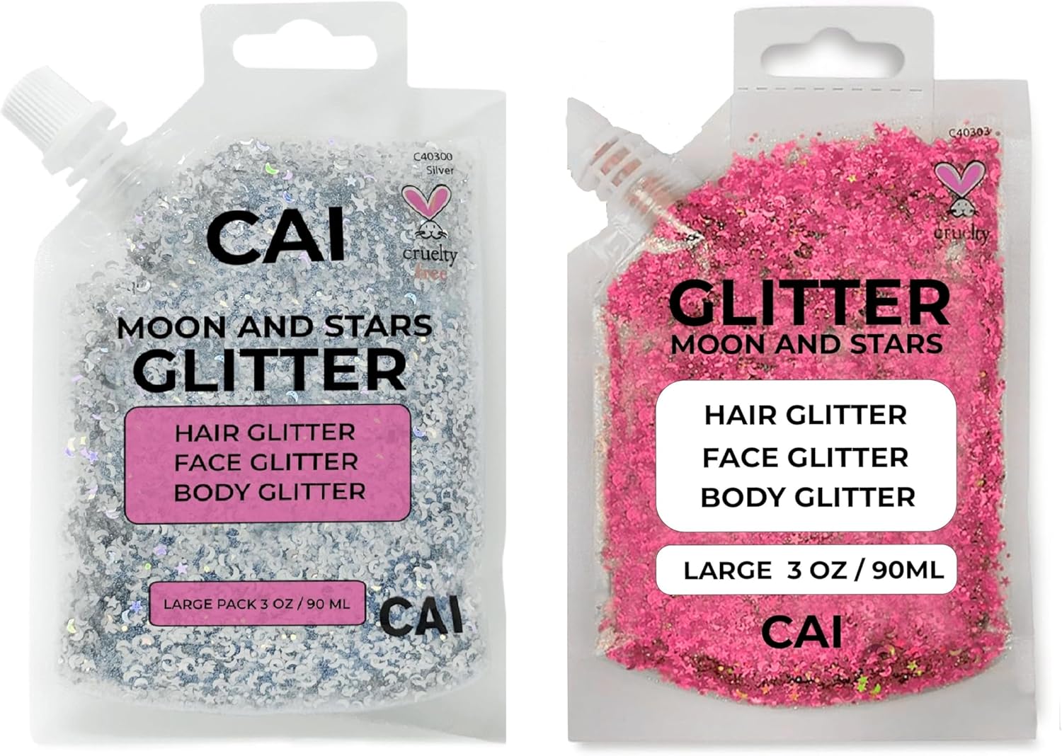 Face, Body & Hair Glitter Gel – Halloween Glitter for Kids and Women – 3 Oz Cosmetic-Grade Gel w/Moon & Stars for Festivals & Halloween Party, Easy Apply & Wash Off - Silver/Pink 2Pack