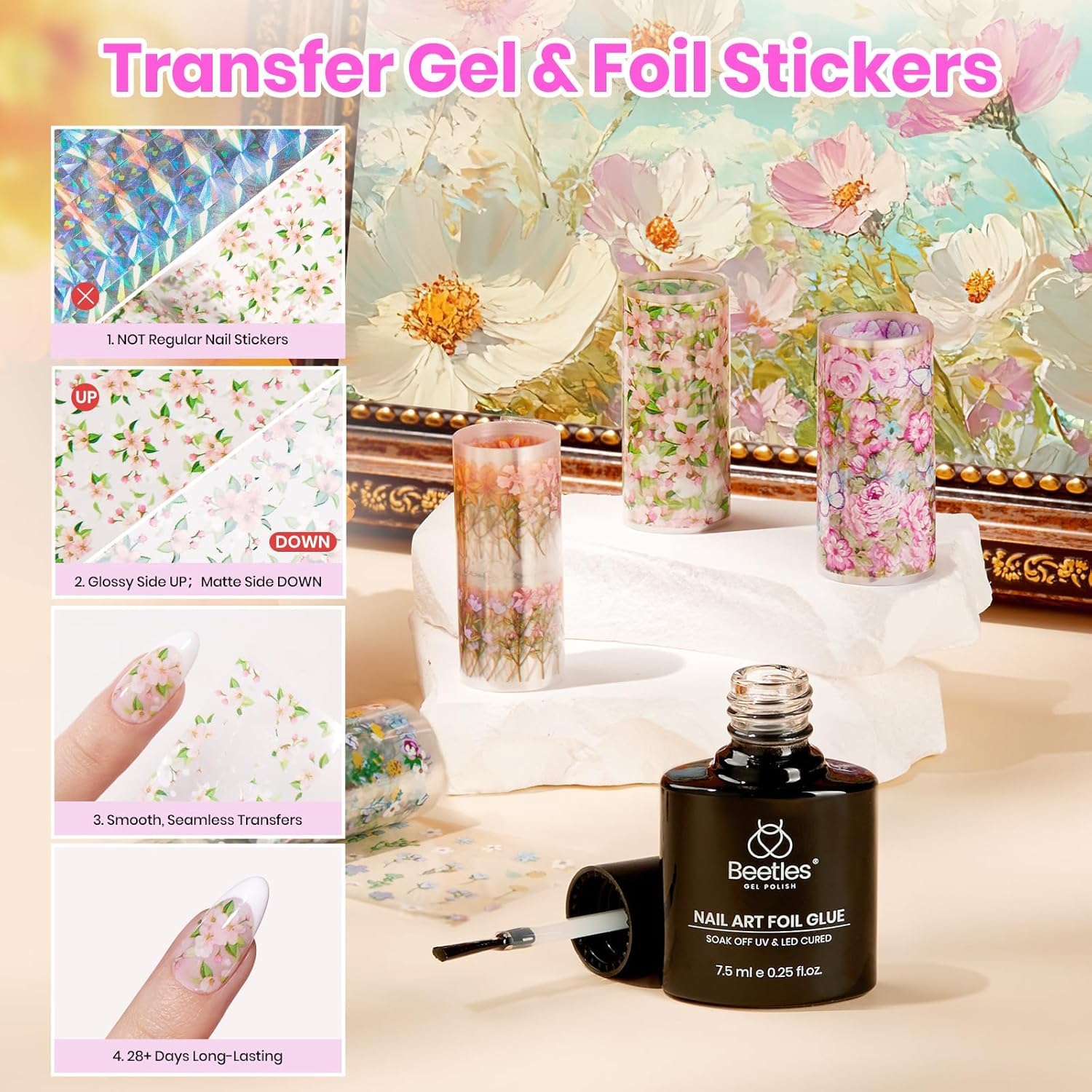 - Included Components : No Wipe Base, Glossy Top Coat, Nail Art Foil Glue, Flower Nail Art Transfer Sticker