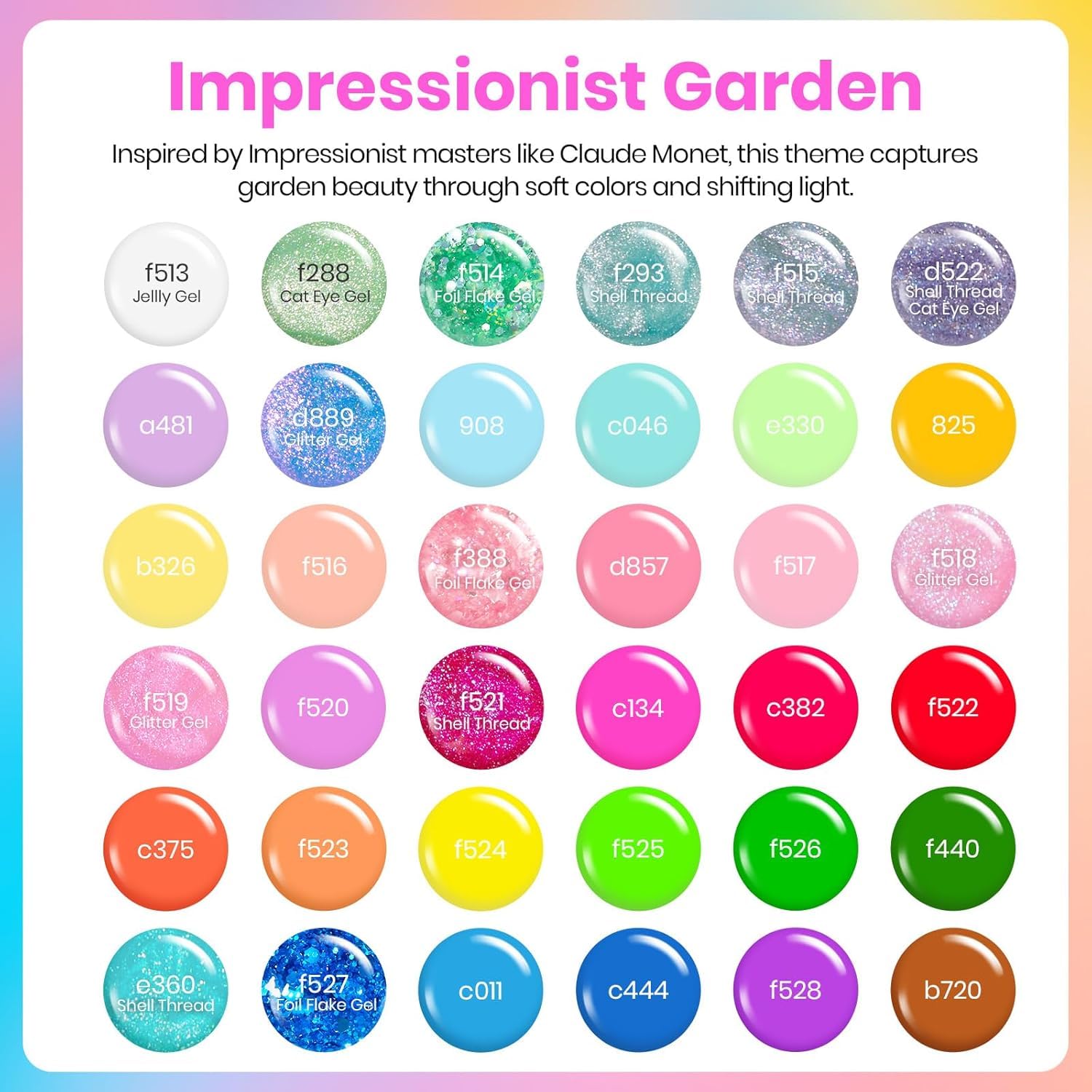 - 36 Colors Gel Nail Kit: Beetles gel nail polish including 36 classic and fashionable colors gel, 1 x No Wipe Base and 1 x Glossy Top Coat, 1 x Nail Art Foil Glue , 3 x Flower Nail Art Transfer Sticker. This Summer gel polish Impressionist Garden set is an essential for everyone!