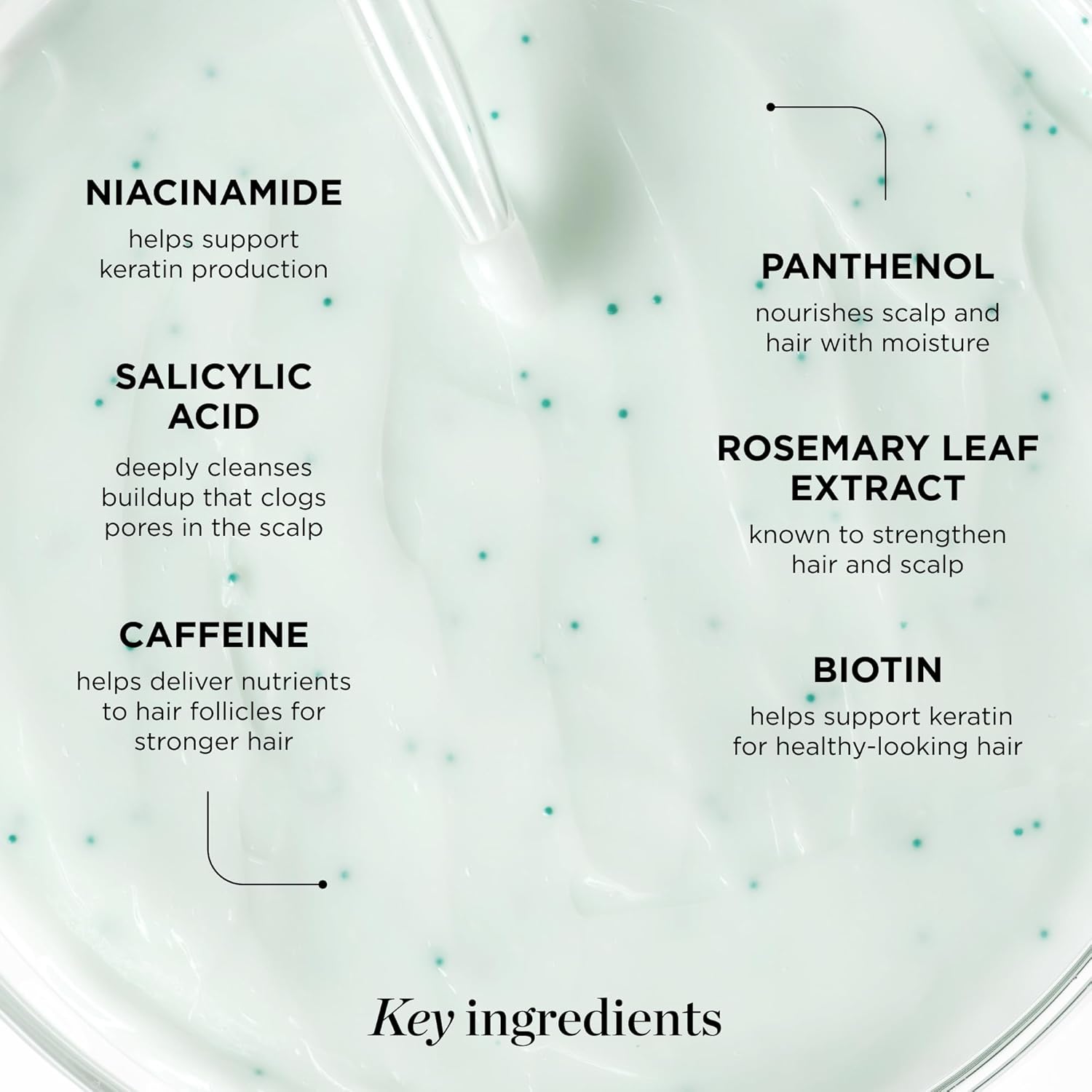 - EXFOLIATES, CLEANSES, AND MOISTURIZES, INCREASING CIRCULATION AND ENCOURAGING HAIR GROWTH AND STRENGTH. Formulated with biotin, rosemary leaf extract, salicylic acid, panthenol, niacinamide, caffeine and formulated without parabens, silicones, sulfates and gluten.