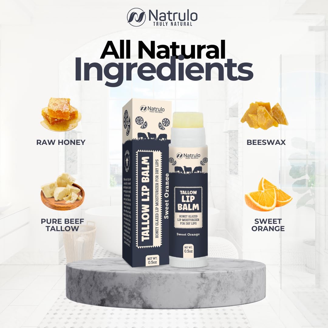 - INTENSELY HYDRATING FORMULA: Immerse your lips in moisture with our grass-fed organic beef tallow lip balm with orange flavor. Crafted with natural fats, akin to those in human skin, it maintains your lips' moisture barrier for enduring hydration and velvety softness.