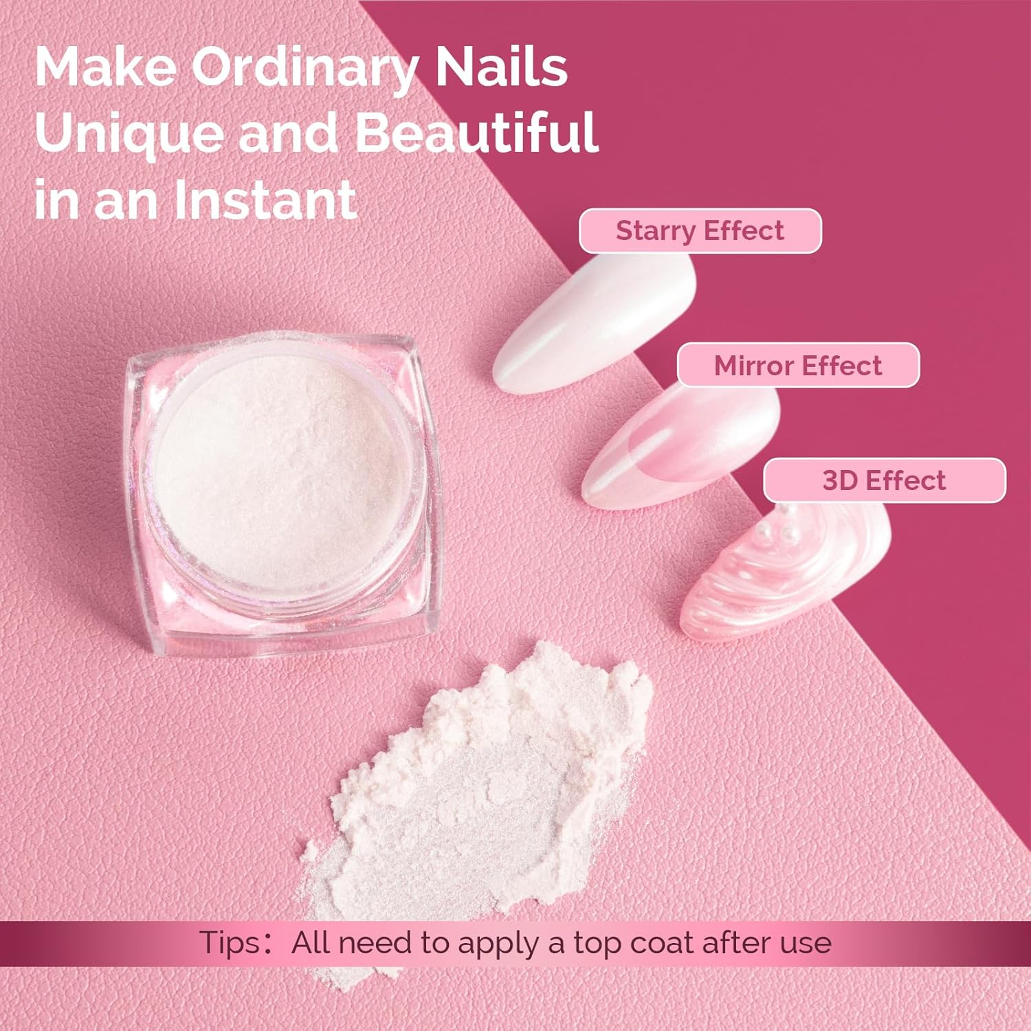 - White Pearl Chrome Nail Powder: Chrome nail powder has a very nice shiny mirror effect and can be used with different colors of gel nail polish to create different effects,just a little powder and your nail will be different