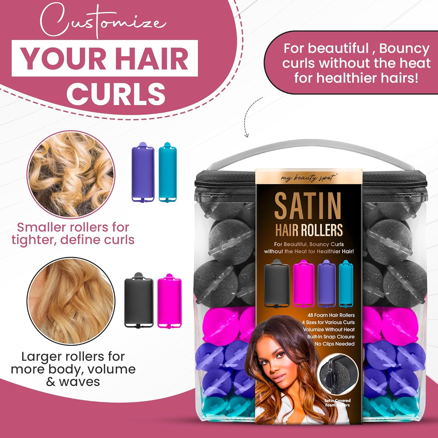 My Beauty Spot Heatless Rollers - Satin Hair Rollers - Overnight Hair Curlers, 48Pcs Overnight Foam Curlers, No Clips, Assorted Sizes & Colors, with Storage Case