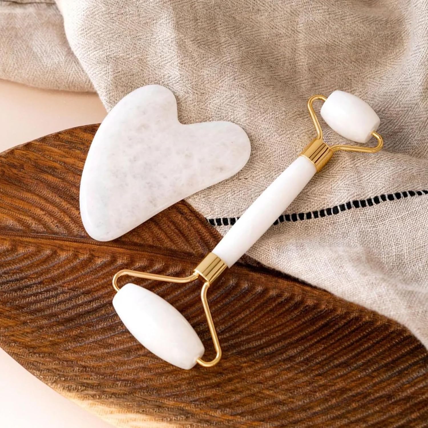 - 2-in-1 Skincare Set – Includes a facial roller for gentle massage and a Gua Sha board for deeper contouring, improving skin elasticity and reducing the appearance of fine lines.
