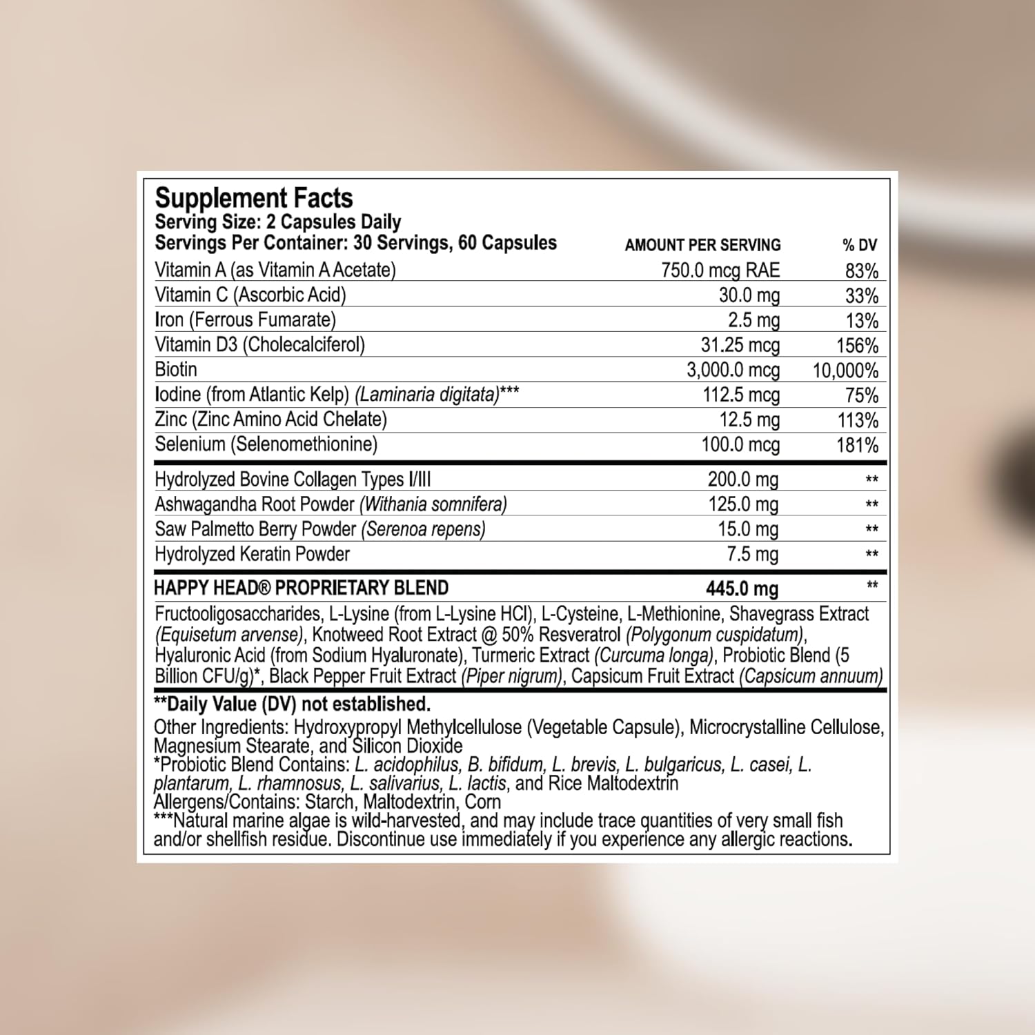 - Developed and formulated by leading dermatologists and hair restoration experts, Happy Head hair growth vitamins are formulated with comprehensive, science-backed ingredients including Vitamins A, C and D, ashwagandha, saw palmetto, types I and III hydrogen bovine collagen, biotin and keratin as well as probiotics for maximum absorption*
