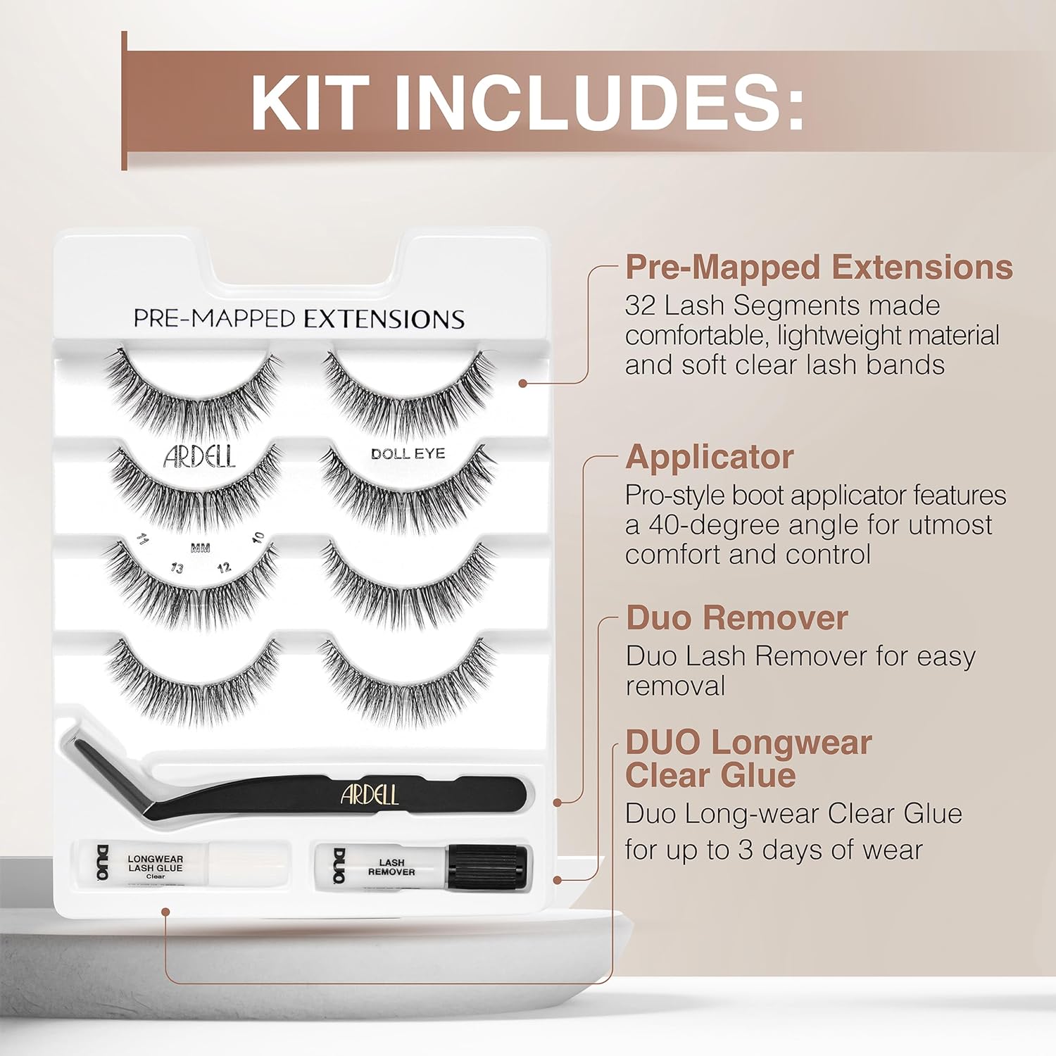 - All-In-One Lash Kit: Includes 4 pairs of pre-mapped false lashes, Duo lash glue, remover, and pro-style boot tweezers. Everything you need for salon-worthy lashes at home or on the go.