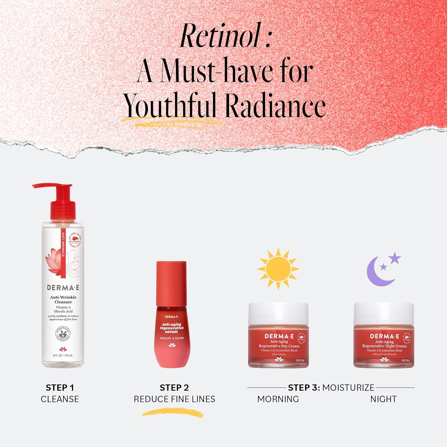 DERMA E Face Serum, Anti Aging Regenerative Retinol Serum for Face, 1 Fl Oz, Vitamin A, Bakuchiol, Glycolic Acid, Green Tea Extract, Helps Reduce Appearance of Fine Lines and Wrinkles