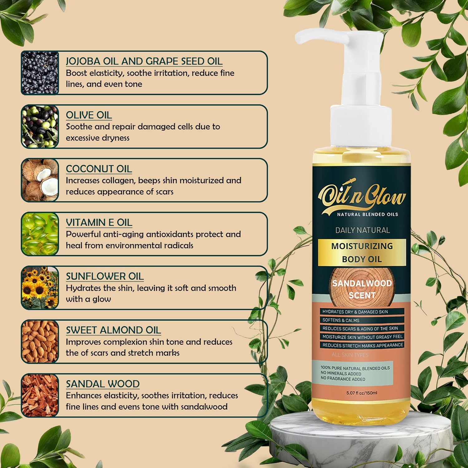 - FREE FROM HARSH CHEMICALS: Our sandalwood body oil is crafted without parabens, phthalates, artificial fragrances, or harsh chemicals, making it an ideal body oil for women and men with sensitive skin. Powered by nature, this nontoxic, non-comedogenic solution is packed with nutrient-rich oils like body coconut oil, bio oil for scars, and almond body oil. Experience pure hydration with a body oil non-greasy finish that respects your skin’s balance and leaves you feeling confident every day.