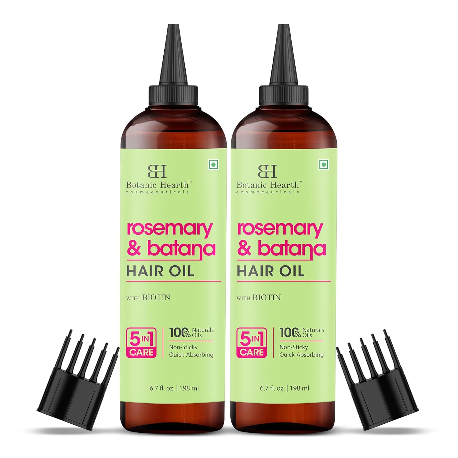 - Nozzle & Comb Applicator: The Rosemary & Batana Hair Oil for hair growth comes with hair oil applicators like nozzle and comb to evenly distribute oil and smoothen knots & frizzes, making the application process effortless
