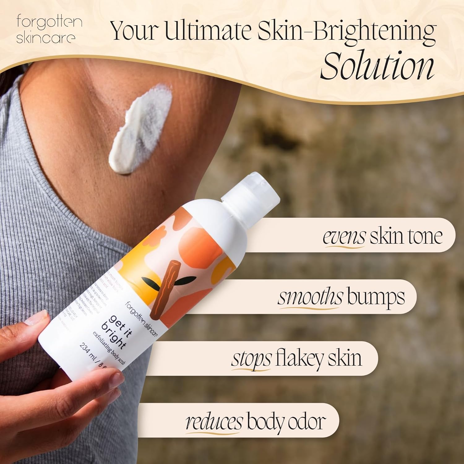 - Brightens Dark Areas & Smooths Texture Formulated with glycolic acid, pumice, and kaolin clay, this exfoliating body scrub targets dark underarms, bikini area, and bumpy skin to reveal a smoother, more even-toned complexion.