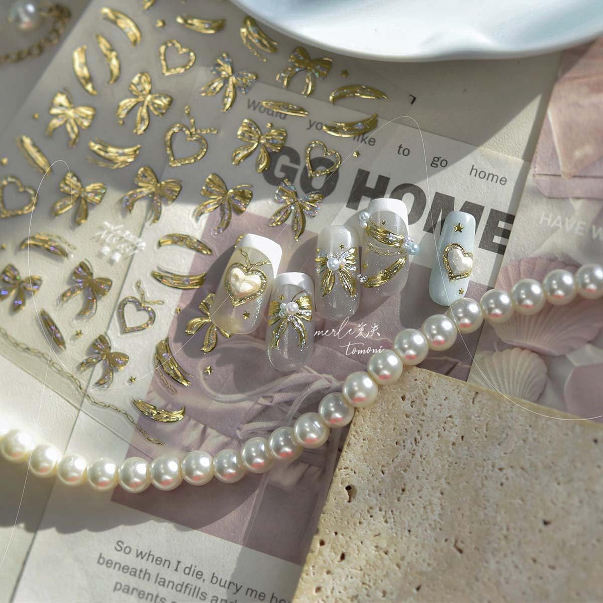 Gold Bow Nail Stickers for Nail Art Heart Bow Nail Decals Coquette Stickers for Nails 3D Self Adhesive Nail Art Supplies & Decorations for Women Girls,1 Sheet DIY Manicure Decor