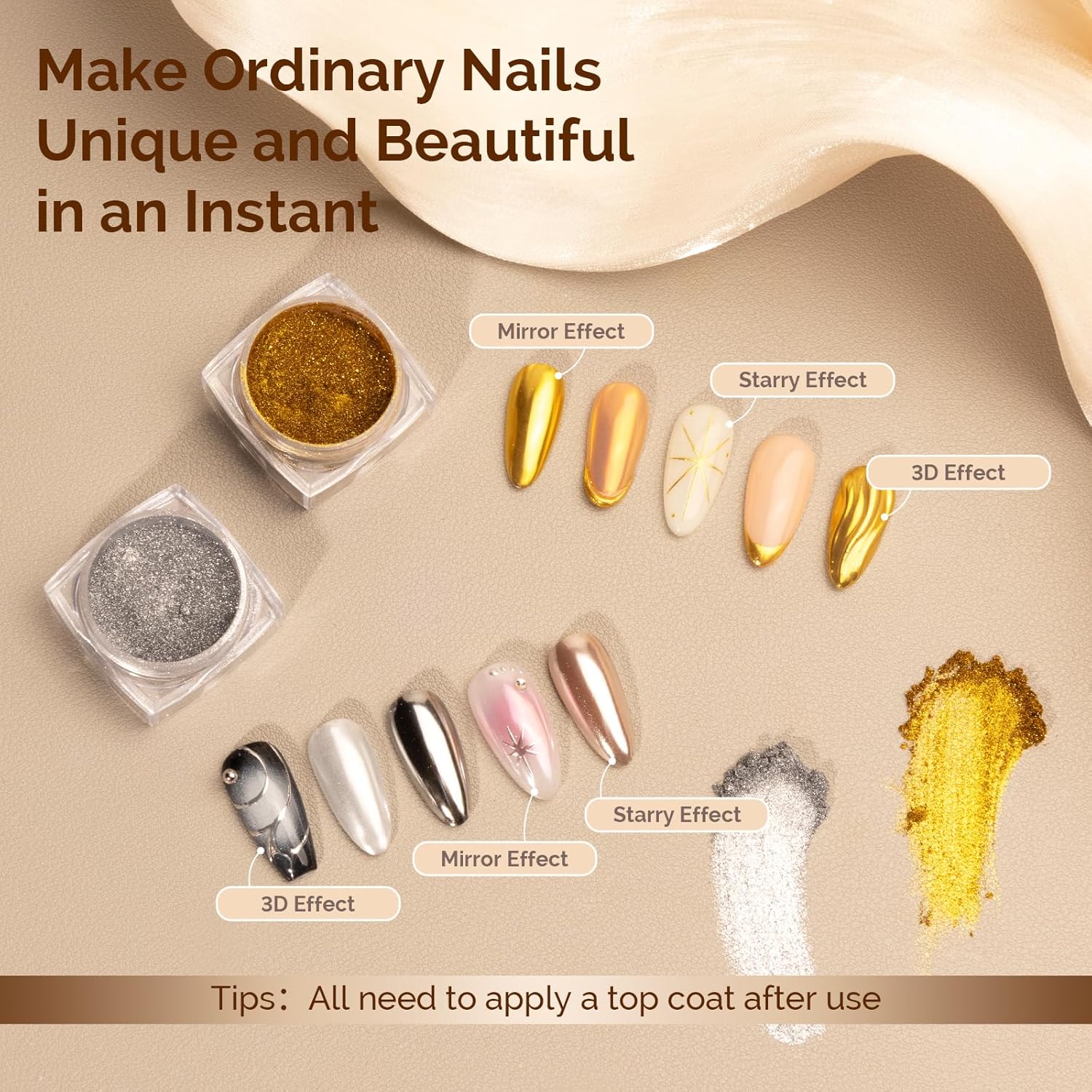 MelodySusie 2Pcs Chrome Nail Powder for Gel Nails,Metallic Mirror Effect Pigment Stylish and Technological Fine Glitter for Home DIY Salon Use