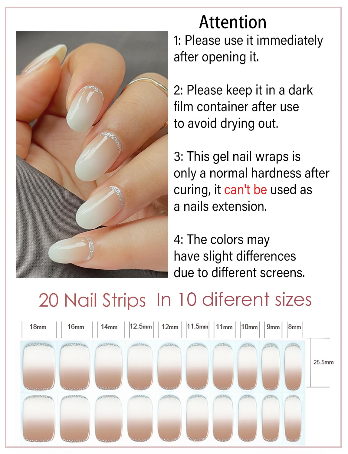 Semi Cured Gel Nail Strips, 20pcs Brown Ombre, Glitter Gel Nail Stickers UV for Home Nails DIY