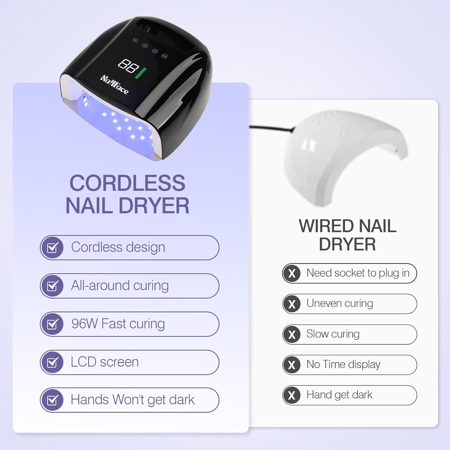 - High-Power Gel UV Light for Nails: 96W cordless UV nail lamp with 42 LED beads ensures rapid, even curing for gel polish and acrylics; Rechargeable LED nail lamp features a 15600mAh battery for 12 hours of cordless use with 3-4 hours charging