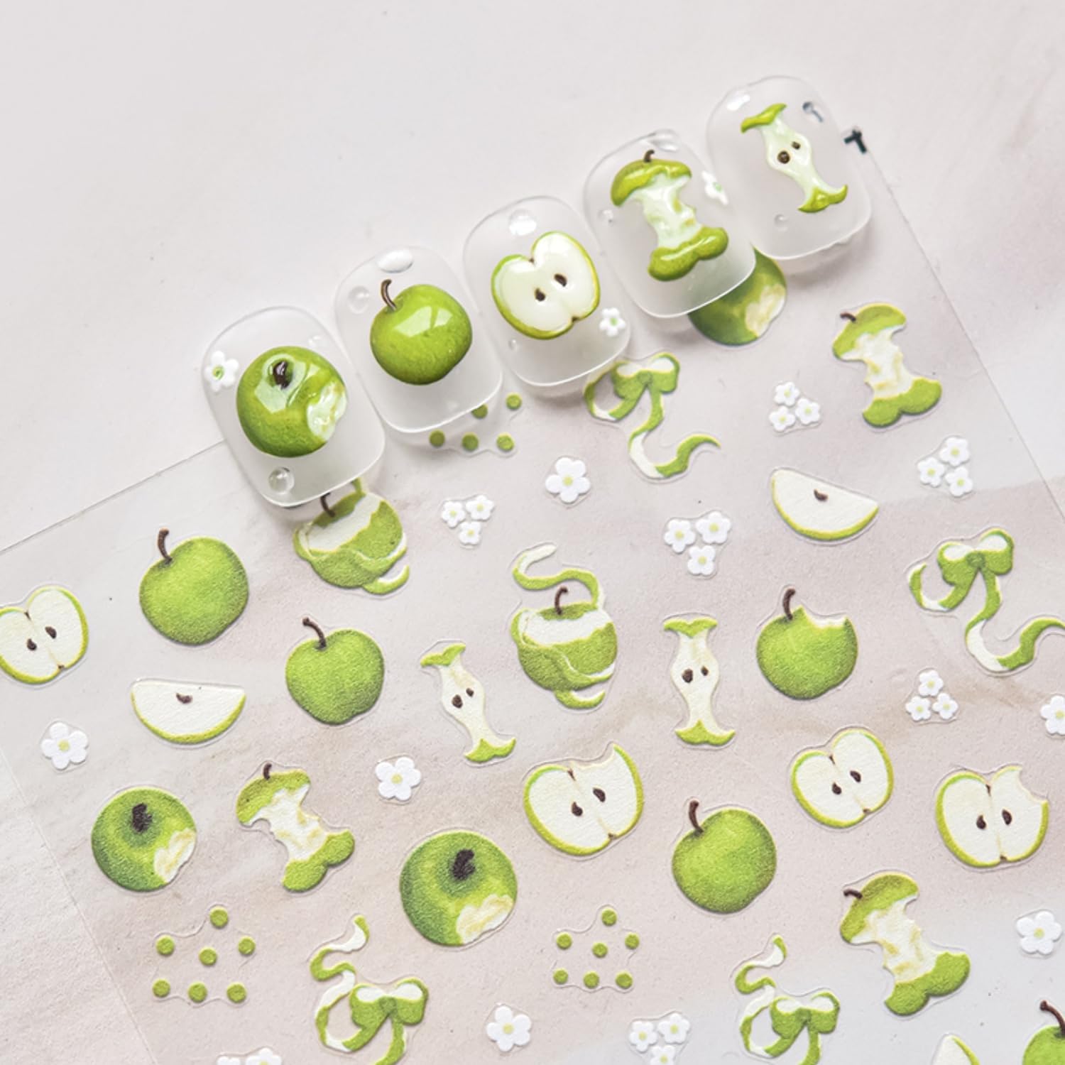 5D Embossed Nail Stickers for Nail Art Green Apple Nail Art Stickers White Flower Nail Decals Self Adhesive Spring Nails Supplies for Women Girls