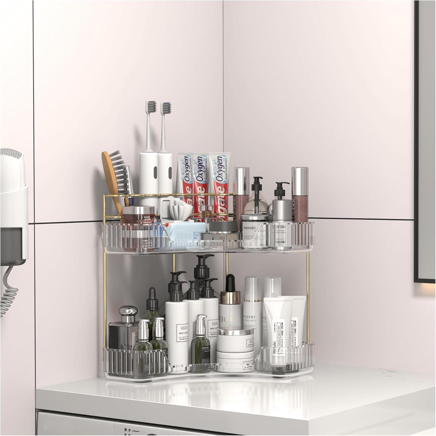- ă90° Corner Bathroom Counter OrganizerăThe 90° quarter-circle design maximizes the unused space that snugly fits bathroom/vanity corners. Multi-layer structure adds 100% vertical storage while occupying minimal counter space.