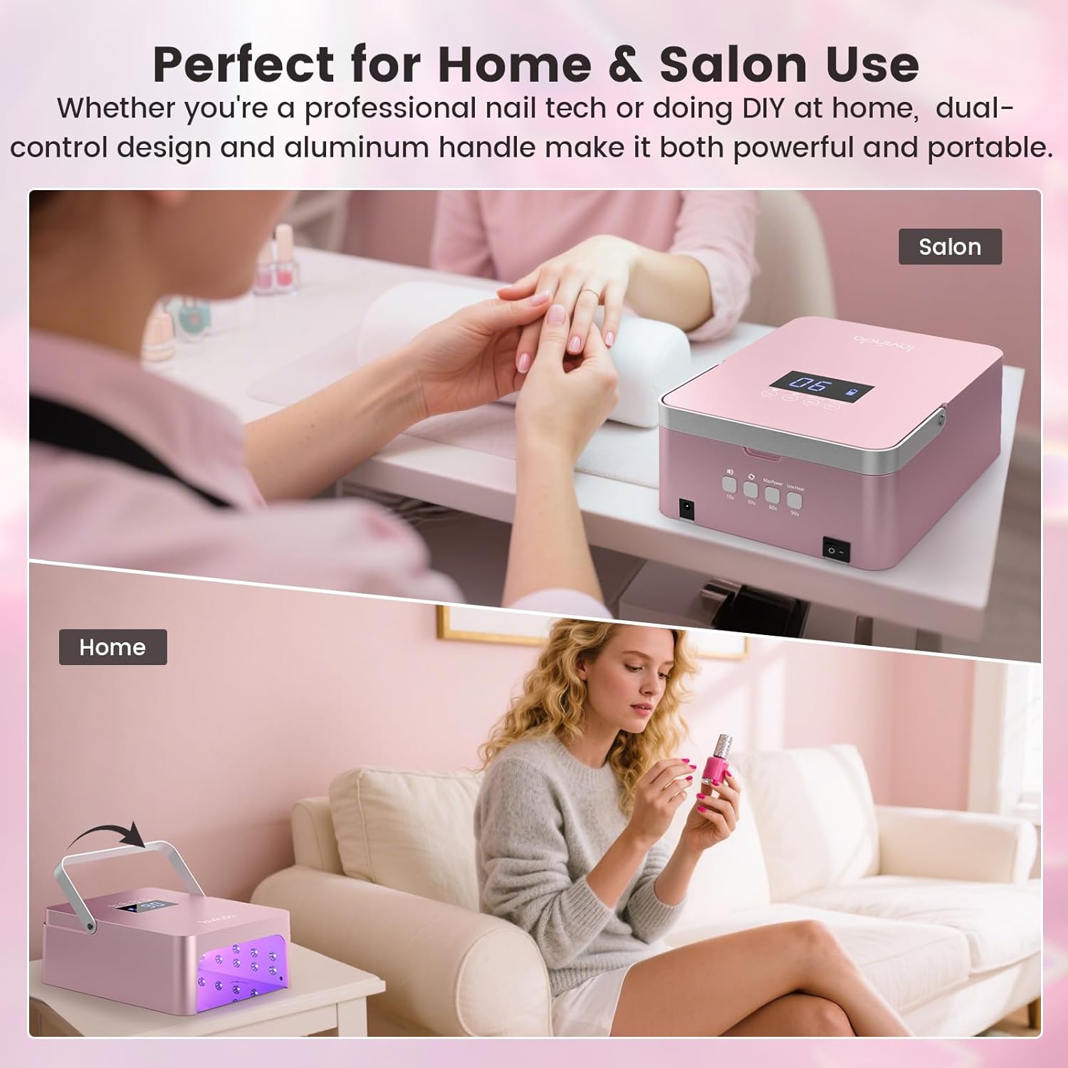 - 【Large-Capacity Nail Dryer with Portable Handle】: This cordless nail lamp measures 9.68" × 7.87" × 3.54", offering extra space for long nails, 3D nail art, and thick gels without touching the sides. The detachable mirrored magnetic base enhances light reflection, while the sturdy aluminum handle makes this LED nail lamp easy to carry between salons or for mobile nail services.