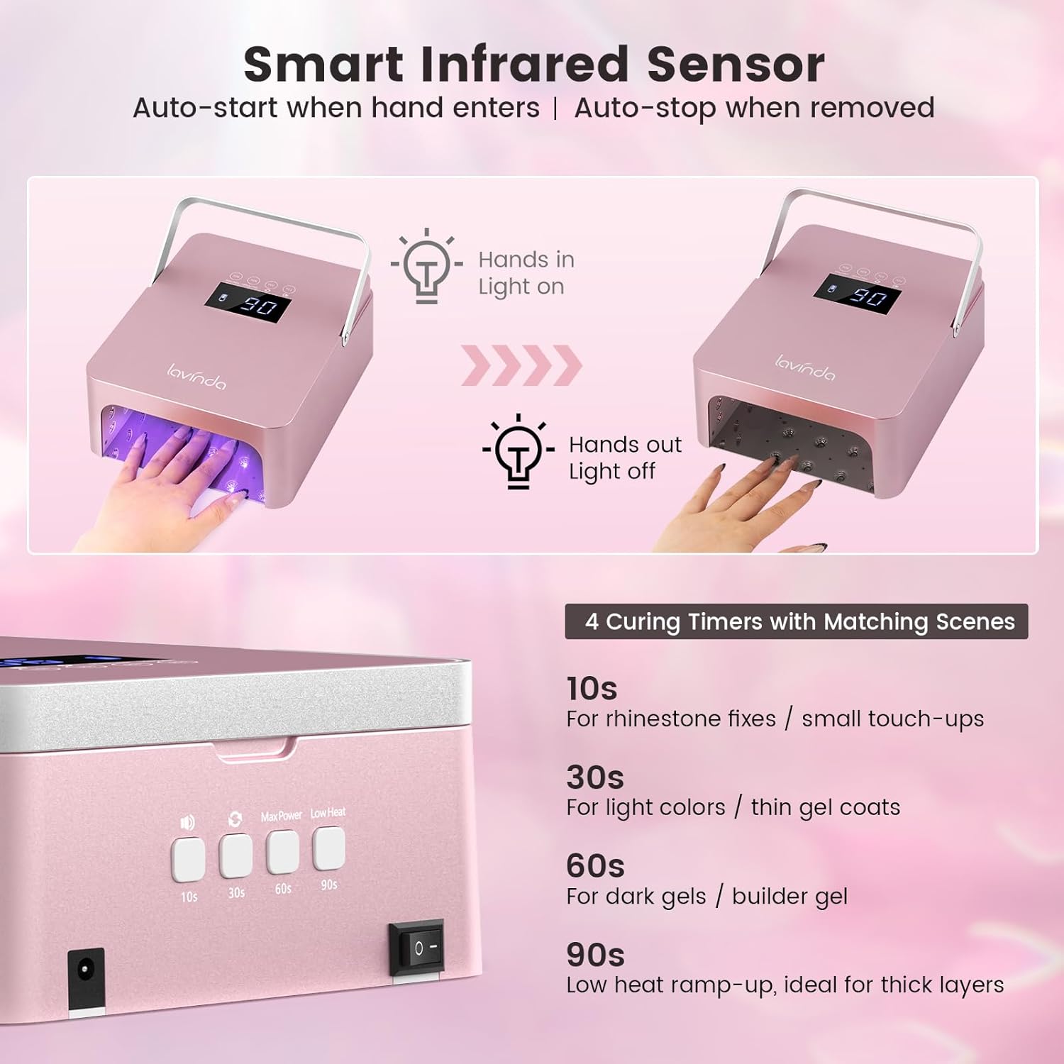- 【Rose Gold Finish & Professional Nail Lamp Design】: With its exclusive rose gold metallic finish, the Lavinda NovaGlow Pro nail lamp combines style and durability. The acetone-resistant ABS body is built for long-term salon use. Backed by Lavinda’s 7+ years of expertise in nail technology, this cordless nail dryer is a luxury choice for both professionals and DIY nail lovers.