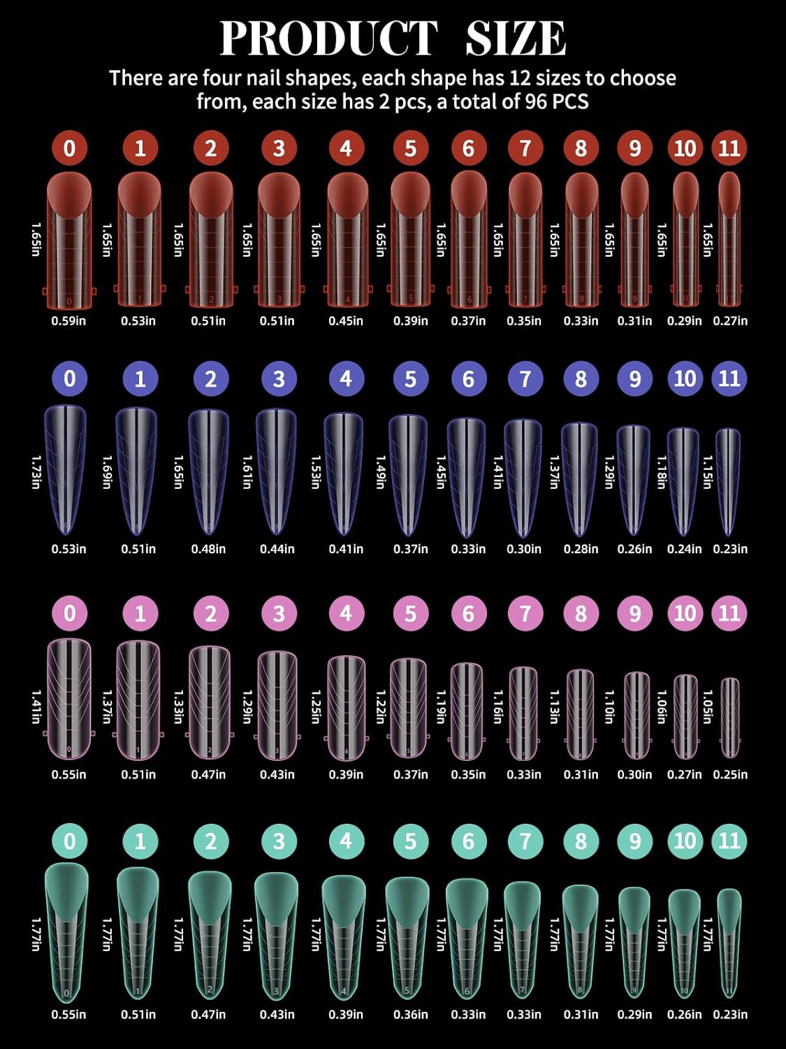- 【Nail Form Mold with 12 Sizes】96pcs stiletto clear dual forms for poly nail gel offers 12 different nail sizes , and each size of long nail tips is separated by a small grid, a total of 12 grids, so they're easy and convenient to choose the suitable size to meet your nail's need.