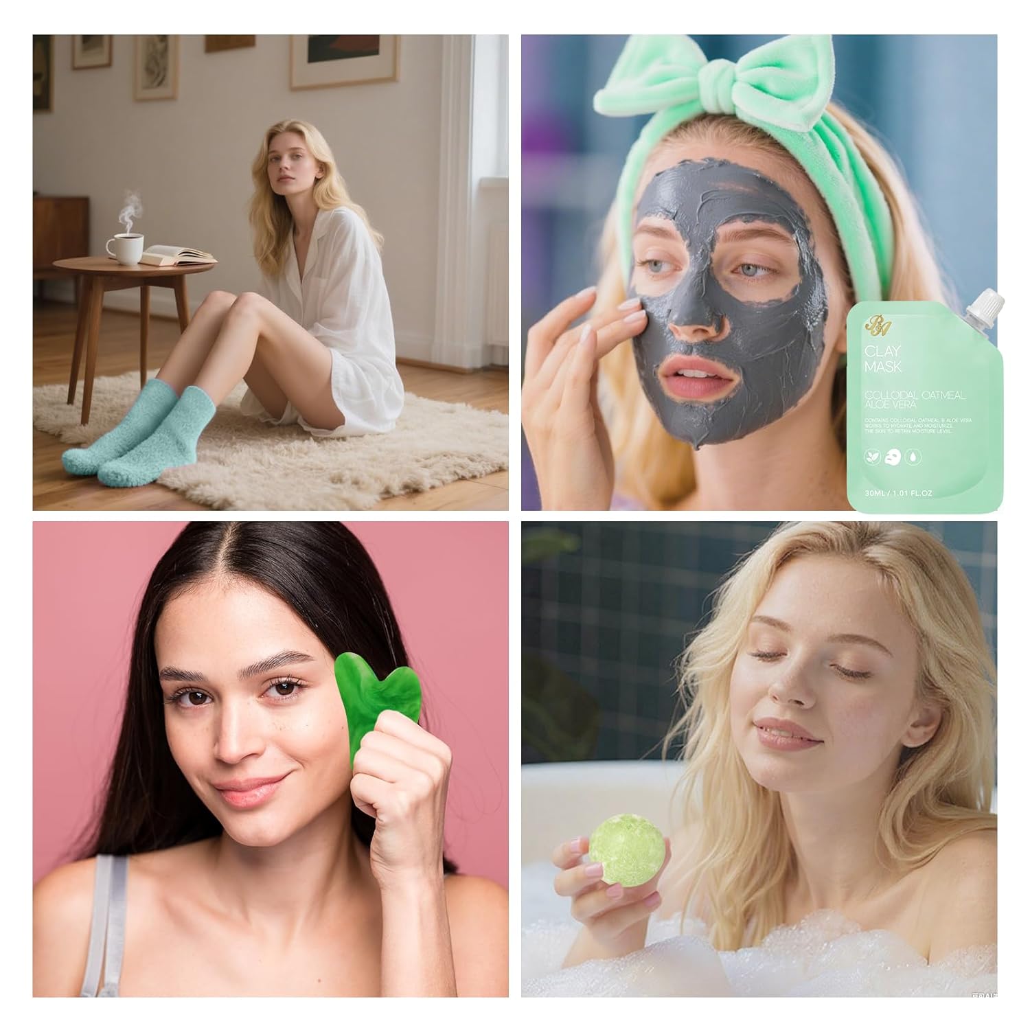 - Head To Toe Skin Care: Let this set pamper your skin! Clay mask to cleanse your skin. Under Eye patches for reduce dark circles, puffiness, eye bags. Gel lip mask and lip gloss for plump lips. Sheet face mask & Collage face mask & face serum for nourished, hydrated skin. Bath bombs to pleasure the body and mind