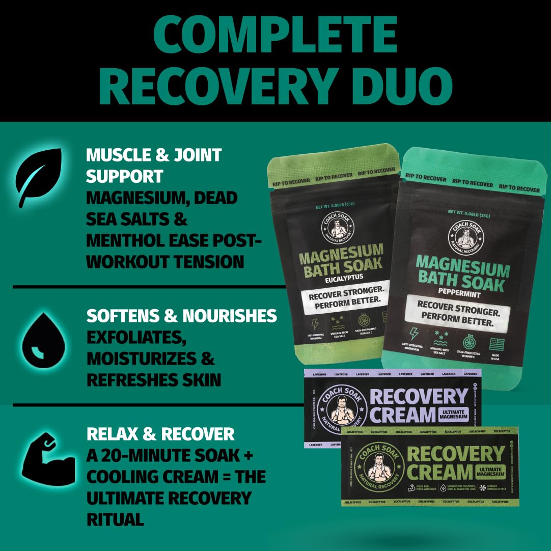 - Rejuvenating Coach Soak: Experience the invigorating benefits of Coach Soak's Magnesium Bath Flakes & Lotion Trial Pack, designed to support athletic recovery. Infused with magnesium flakes and menthol, it revitalizes and refreshes after intense workouts