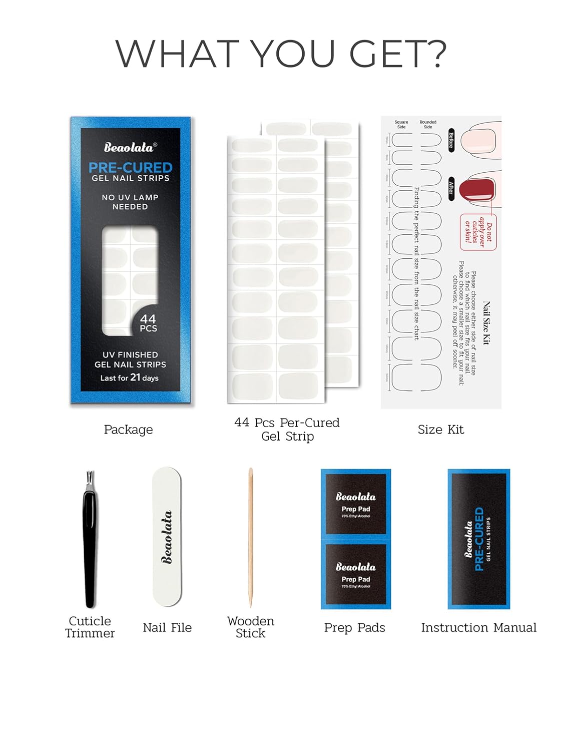 - CONTAINS: 44 gel nails strips, 2 prep pad 1 nail file, 1 wood stick,1 nail size kit, and 1 instruction.