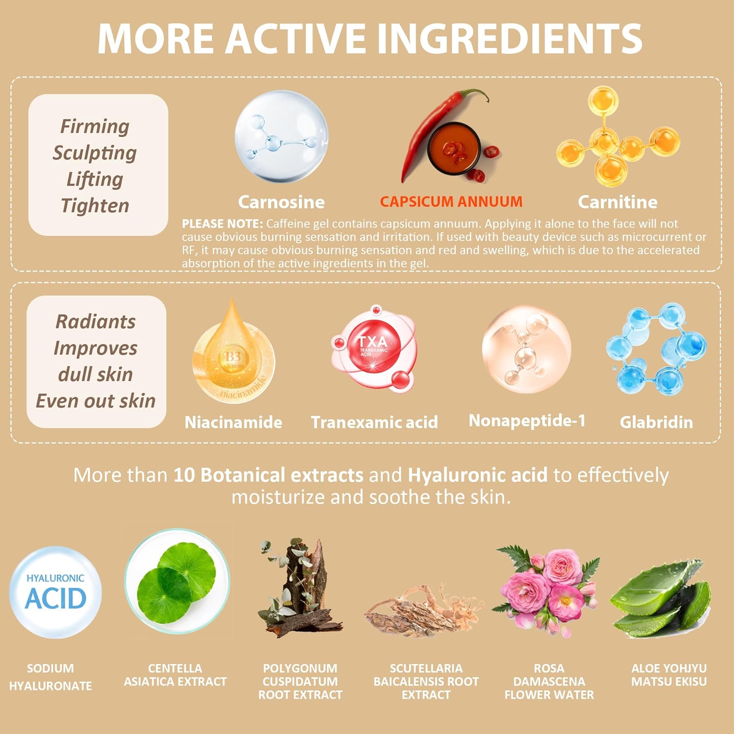 - PLEASE NOTE: Applying caffeine firming gel alone to the face will not cause obvious burning sensation and irritation. If used with beauty device such as microcurrent or radio frequency, it may cause obvious burning sensation and red and swelling, which is due to the accelerated absorption of the active ingredients in the gel. PLEASE USE WITH CAUTION ON THE FACE AND OTHER SENSITIVE AREAS. DO NOT LEAVE ON THE SKIN FOR MORE THAN 15 MINUTES( IF USE WITH DEVICE);