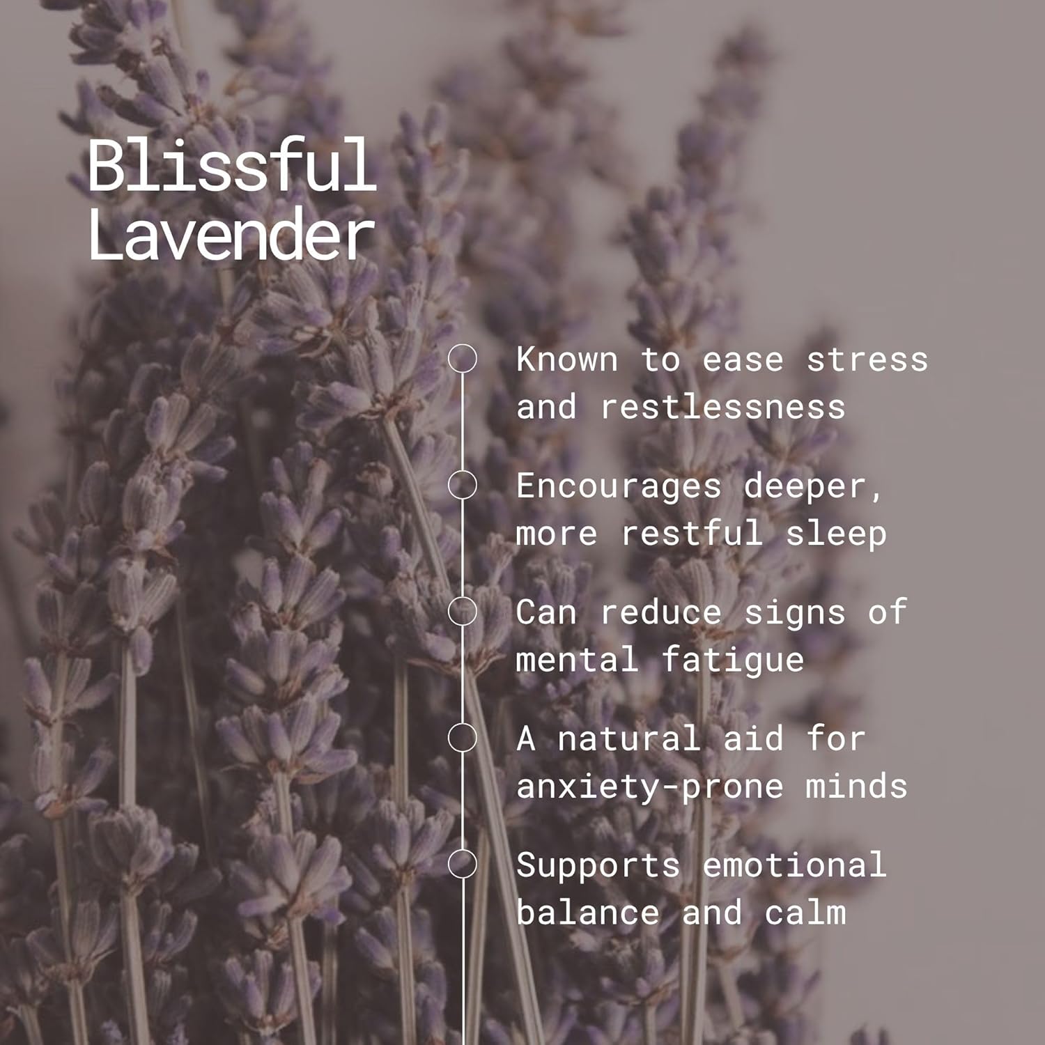 - 💜 Blissful Lavender – Calming Floral Scent for Rest & Relaxation Infused with the tranquil essence of pure lavender, this soothing fragrance helps ease stress, calm the mind, and prepare the body for restful sleep. Ideal for evening rituals, meditation, or spa-like relaxation, Blissful Lavender transforms any space into a serene haven of peace and stillness.