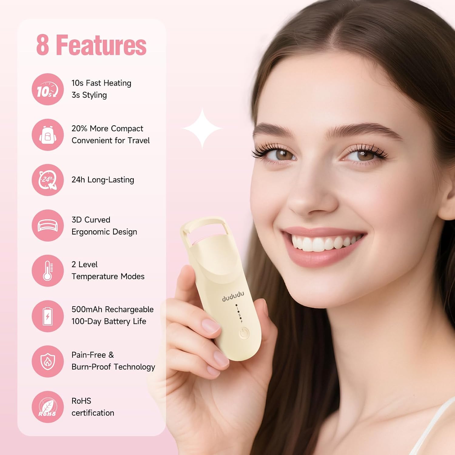 DUDUDU Heated Eyelash Curler, Portable Travel-Size Mini Electric Heated Lash Curler - 2-Level Adjustable Temp & Type-C Recharge, 10S Heat 3S Style 24H Lift for Long-Lasting Natural Effortless Curves