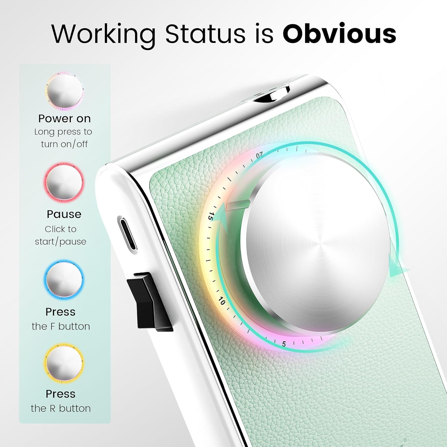 - 【Rainbow Light Turntable Design】Aviation cluminum knob, flexible control, the light color changes according to the working status(four colors). The ergonomic handle is crafted with a special textured finish, providing a non-slip grip and comfortable handling during use.